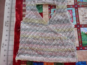 I like the way it crosses over in the front, but I am not looking forward to sewing on the snaps. I’ll have to think about it. I need to take a better picture. You can’t see the colors here—— lime, blue, pink, aqua and cream.