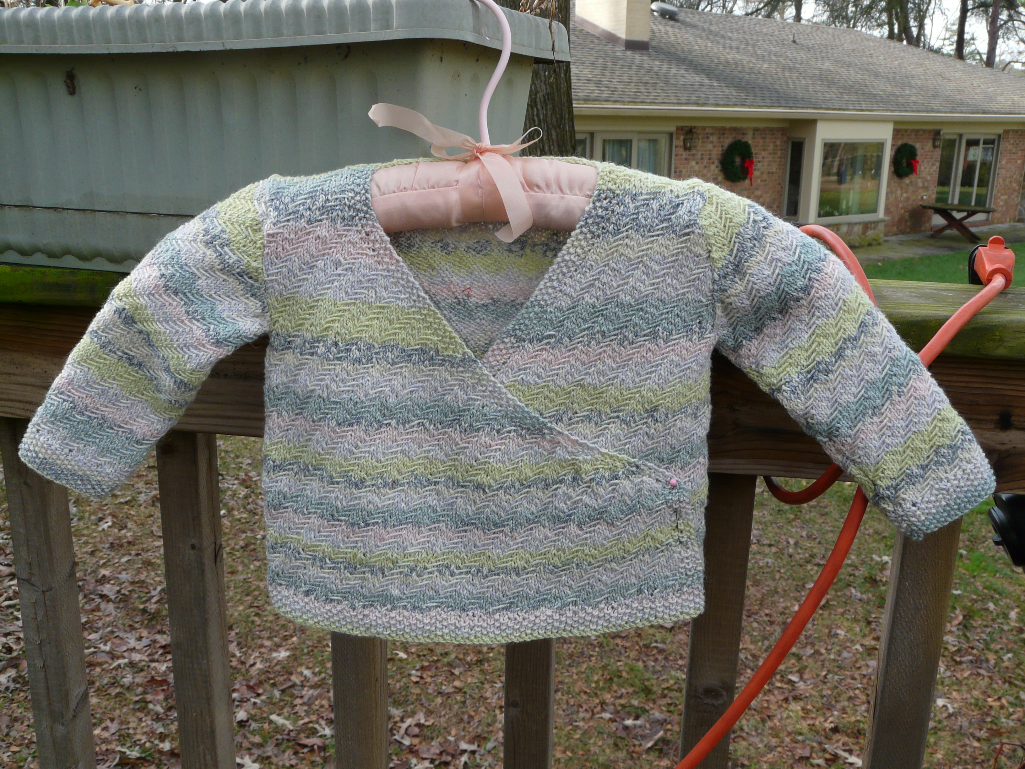 It was deceit enough to take a picture outside. I really liked making this sweater. Coming up the back and going down the front was a nice feature. I still haven’t decided on buttons yet, but the baby isn’t due until February, so there’s time. I may just let my daughter decide.