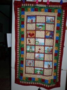 Here’s the Jim Shore calendar wall quilt that I made for my daughter. I personalized it by adding an appliqued heart and special dates. I added five hanger loops across the top with the leftover binding. I’m very happy with the results.