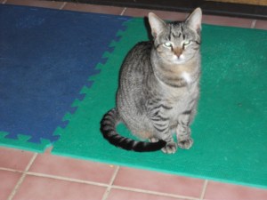 Flo spent a lot of time looking for him. She even asked us to look, but we didn’t have any luck either. And, then, when Doug was getting out his good shoes, there was Skunky, sleeping in his shoes. He showed Skunky to Flo. Was she happy? No. She is mad at Skunky for hiding. Poor Skunky. He is just laying there in the hallway.