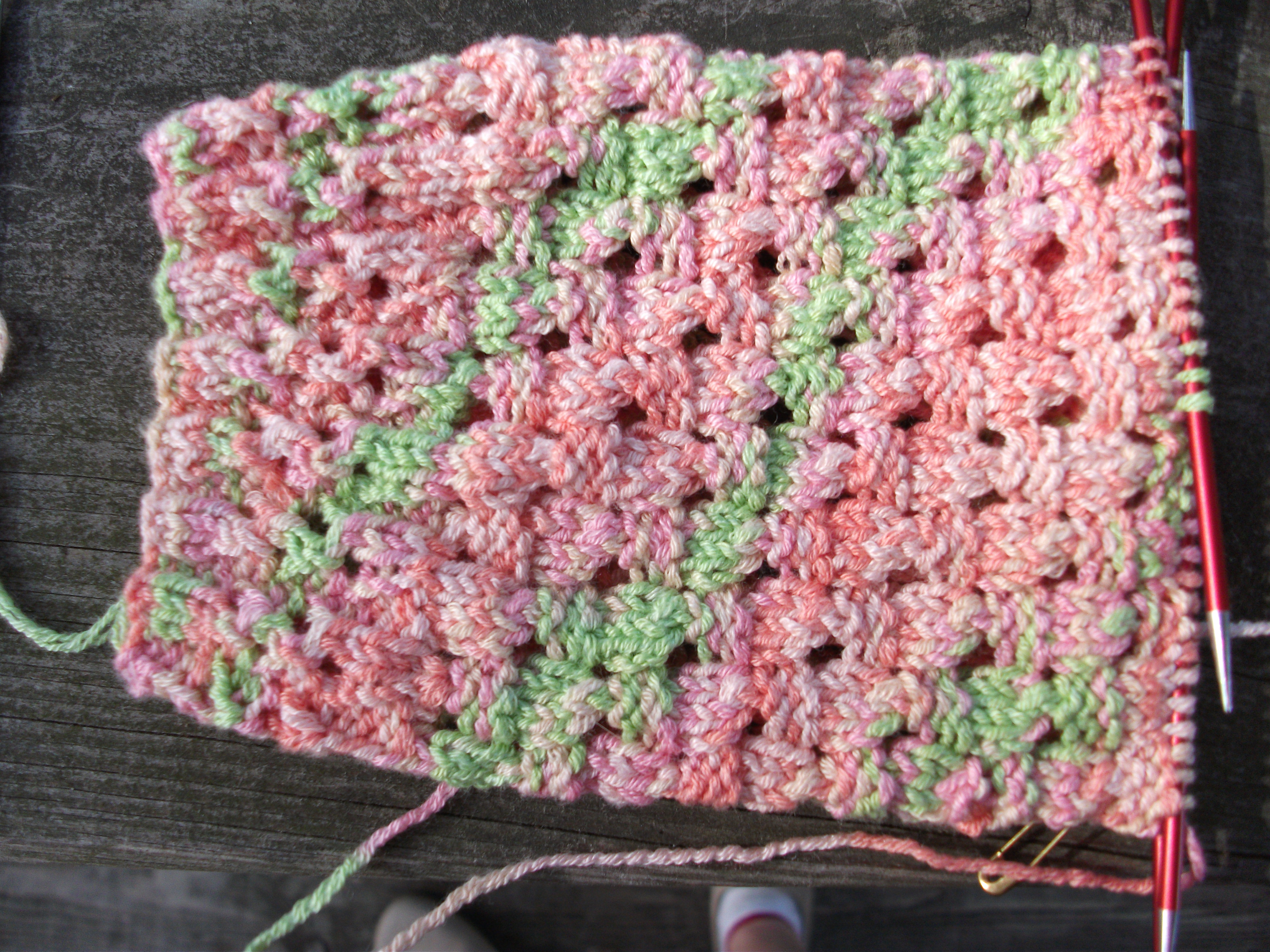 This pattern is Tatami from Knitted Socks East and West using Panda Cotton in Telips. The picture doesn’t show the pretty colors very well. I’ll try to do better next time. I could not get gauge so I just changed the number of stitches and went on. As of this morning, I have finished the heel and about one inch into the foot. Now, I’m hoping that I have enough yarn. I probably should have started at the toes. I must have some excitement in my life. When these are finished, I’ll have made nine pairs of socks this year with only three pair to go.