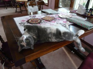 I’ve been trying for weeks to get the little girls to the vets for their shots. Cora is easy to catch because she usually takes a nap on the dining table after breakfast. Note the folded over placemats. My main problem is little Flo. Even if she comes in for breakfast, trying to find her when it’s time to go isn’t easy. If she wants to go out, she has a sixth sense as to when and where an escape is possible. If she decides to stay in, she can get herself into a hidey hole that you never knew even excited. This morning, I noticed her going into a kitchen cupboard. I quietly closed the door and set about getting ready to go. When the time came, Doug put Cora in a carrier and I took her out to the car. Somehow, he managed to get Flo out of the closet and into a carrier. Ah, success. Half the battle was over. It takes about 15 minutes to get there. For fourteen they screamed and cried like they were being murdered. I am so glad it was hot enough to put on the air-conditioning. Once inside, they settled down. Cora sat with her back to me. Flo needed scratching. The place was half empty and since they were just getting shots, I didn’t have to wait too long—-about as long as it takes to cast on for socks and knit a few rounds. In the examining room, Cora refused to come out. The kid managed to grab her hind legs, but somehow, she managed to dig her claws into something inside. I held on to the carrier while he wiggled her loose. Speaking of loose, I use the word kid loosely. I mean, as far as I’m concerned my son is a kid and he is 26 years old. Anyway, Cora was weighed, stuck and generally tossed about. When it was time for her to get back in her carrier, she didn’t want to go. I think she wanted to take names. We finally managed to shove her back in. And, finally, it was Flo’s turn. Having observed all this, she realized what was going on and she was the perfect little princess she can be. Maybe she remembers getting fixed up here last year when she was sliced.
