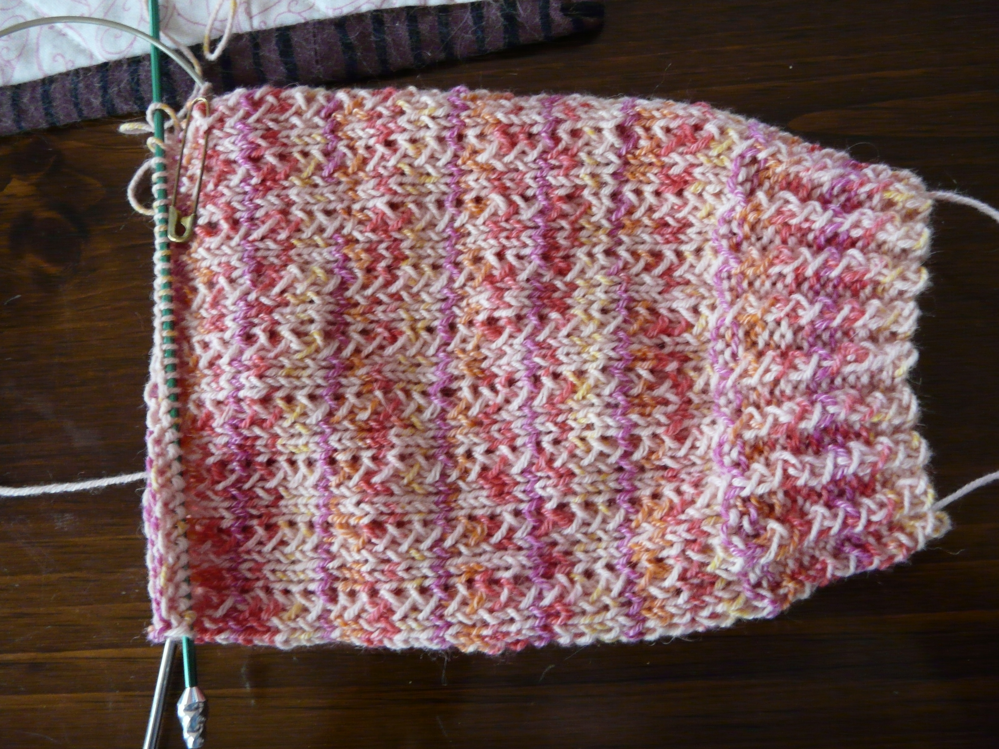 I thought it was time for a plain pair of socks. As you can see, I didn’t make it. I didn’t even start out with a plain rib. And whereas the yarn is subdued, it isn’t plain either. This is Sockotta yarn which is nice for Summer. The leg is purposely loose. I used a smaller needle for the heel gusset and decreased an additional six stitches on the foot. It fits just the way I want it.
