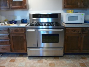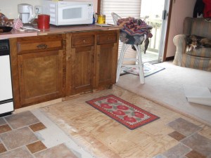 Frank has been doing a great job on re-purposing the old cabinets. And with the old stove gone, the floor can be finished.