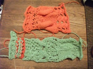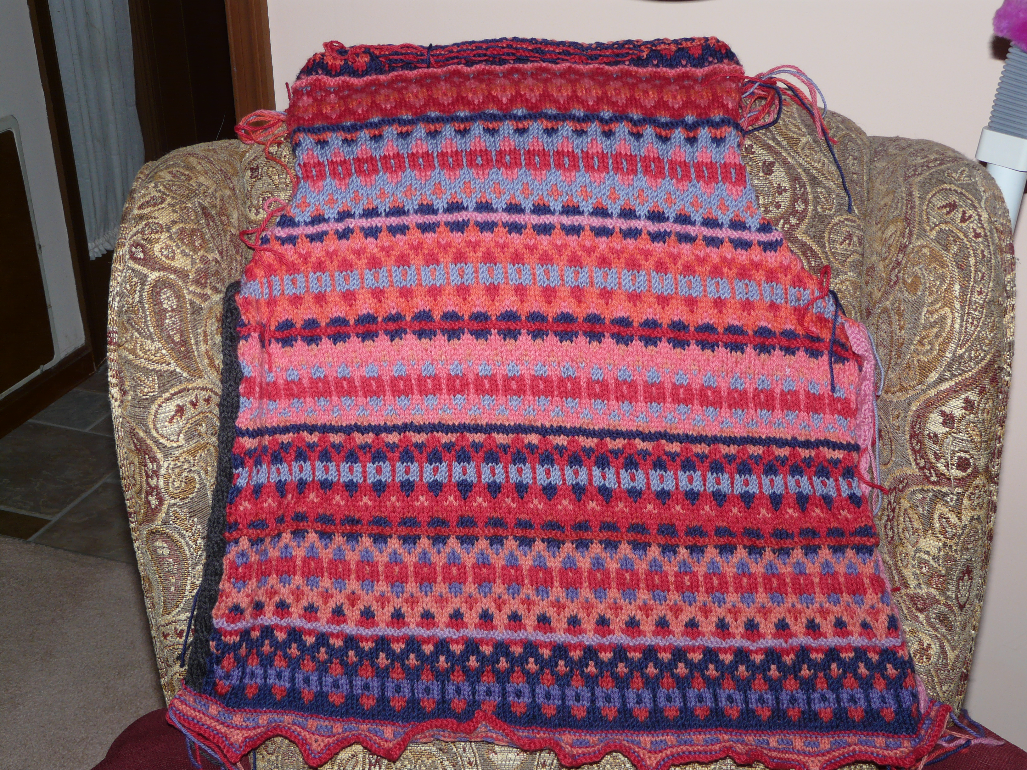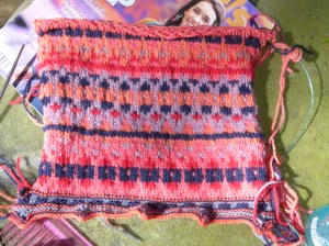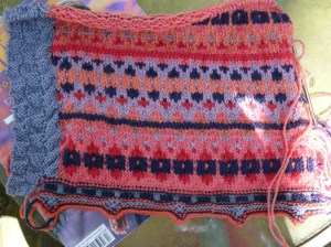 What do I do? Why, rip it out of course. I only had to make one cut in the yarn and that was due to the two rows that had the same yarn in the patterning. So, I could say that there were no unnecessary cuts. When I finish this front I’ll make an attached band my way.