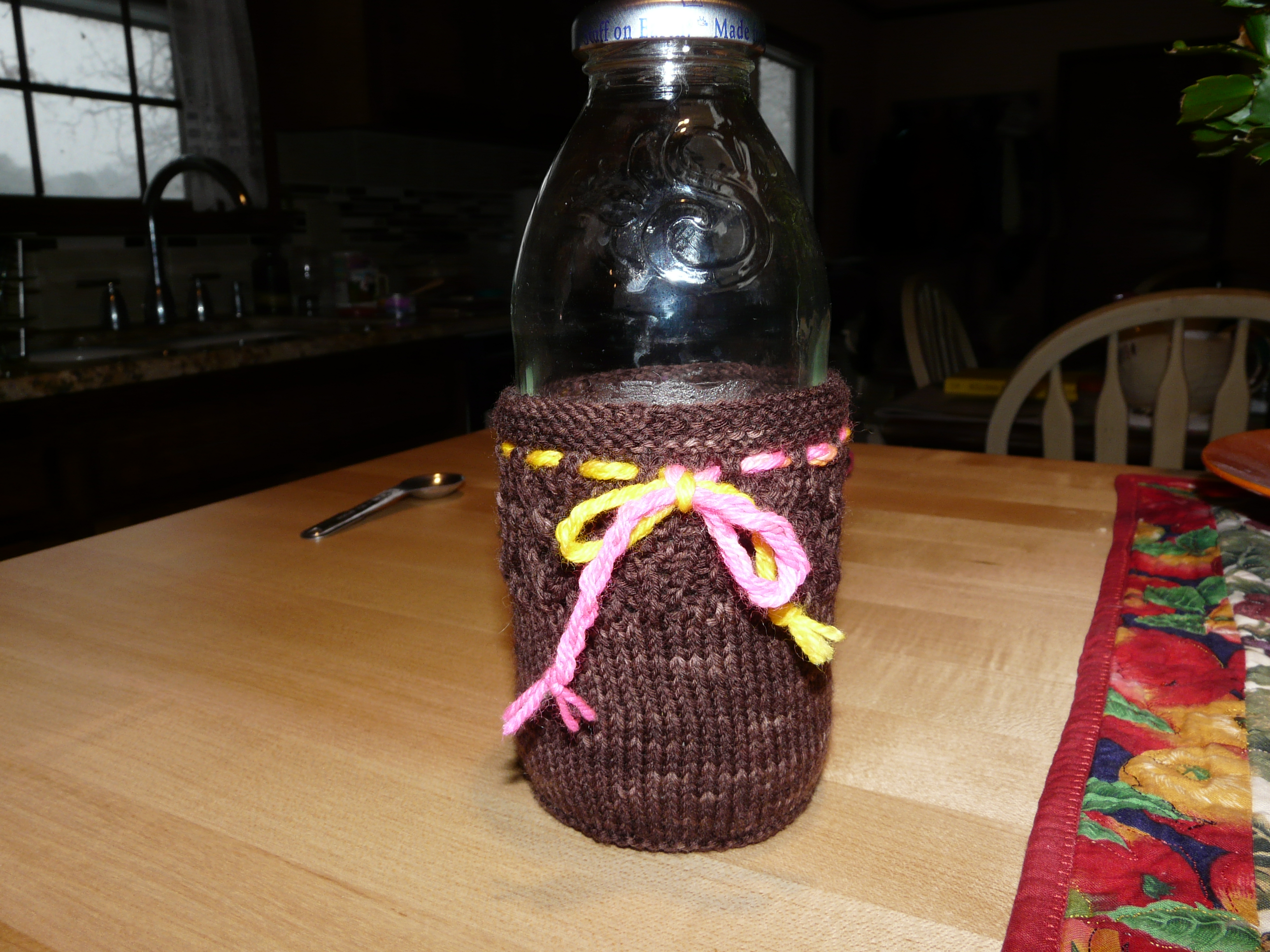 A little kit for a sachet bag came with one of my club kits. I looked at it. I said, “That’s nice.” And tossed it into my knitting stand. I really had no use for it. I’m not a sachet bag kind of person. Since I go through about fifteen panties a week, I couldn’t come up with a reason to make it. Then Sweetums bought a case of Snapple in plastic bottles, and I thought, “New water bottles!” I only had a few left from the case of green tea. I just keep refilling them.