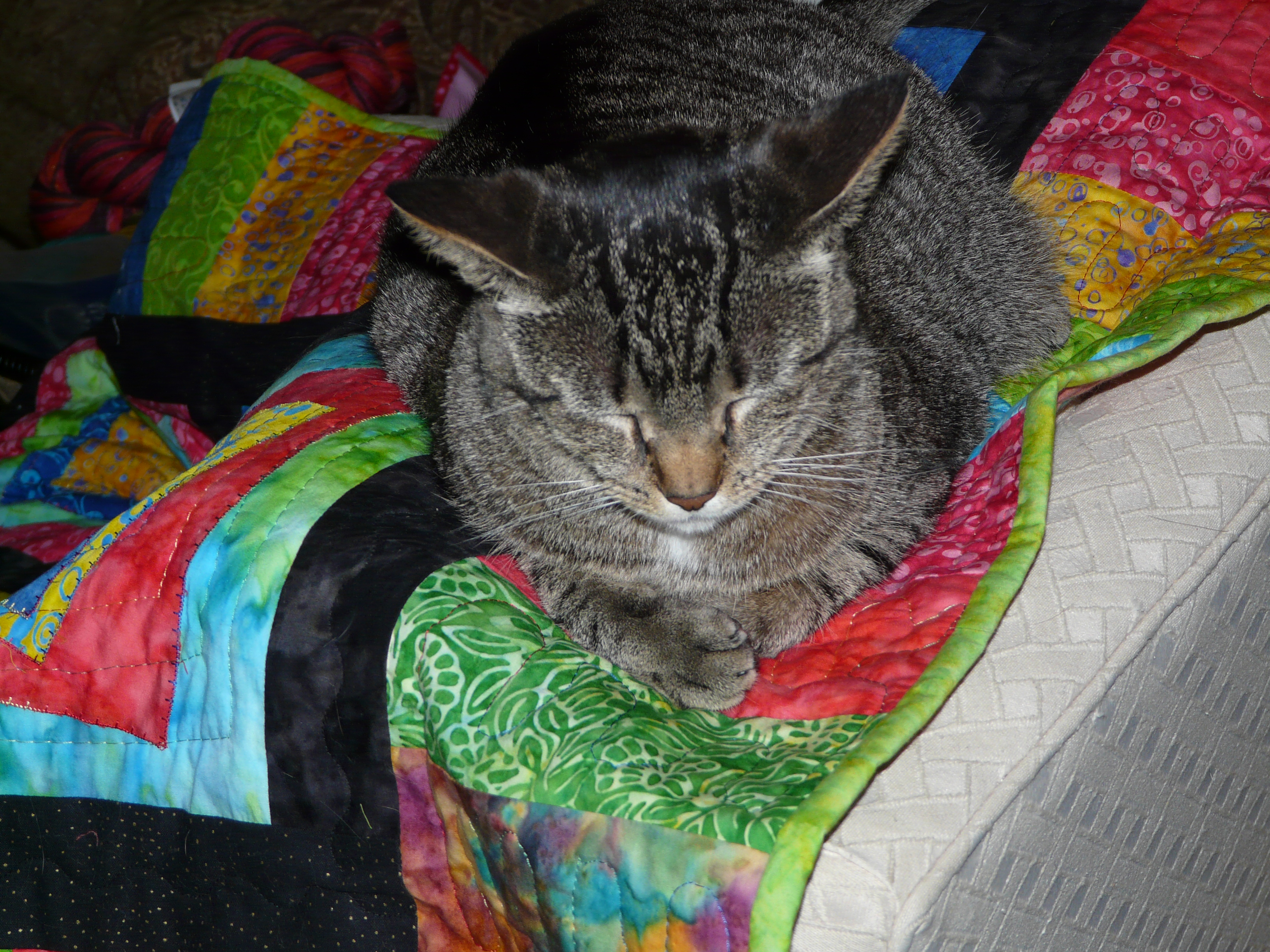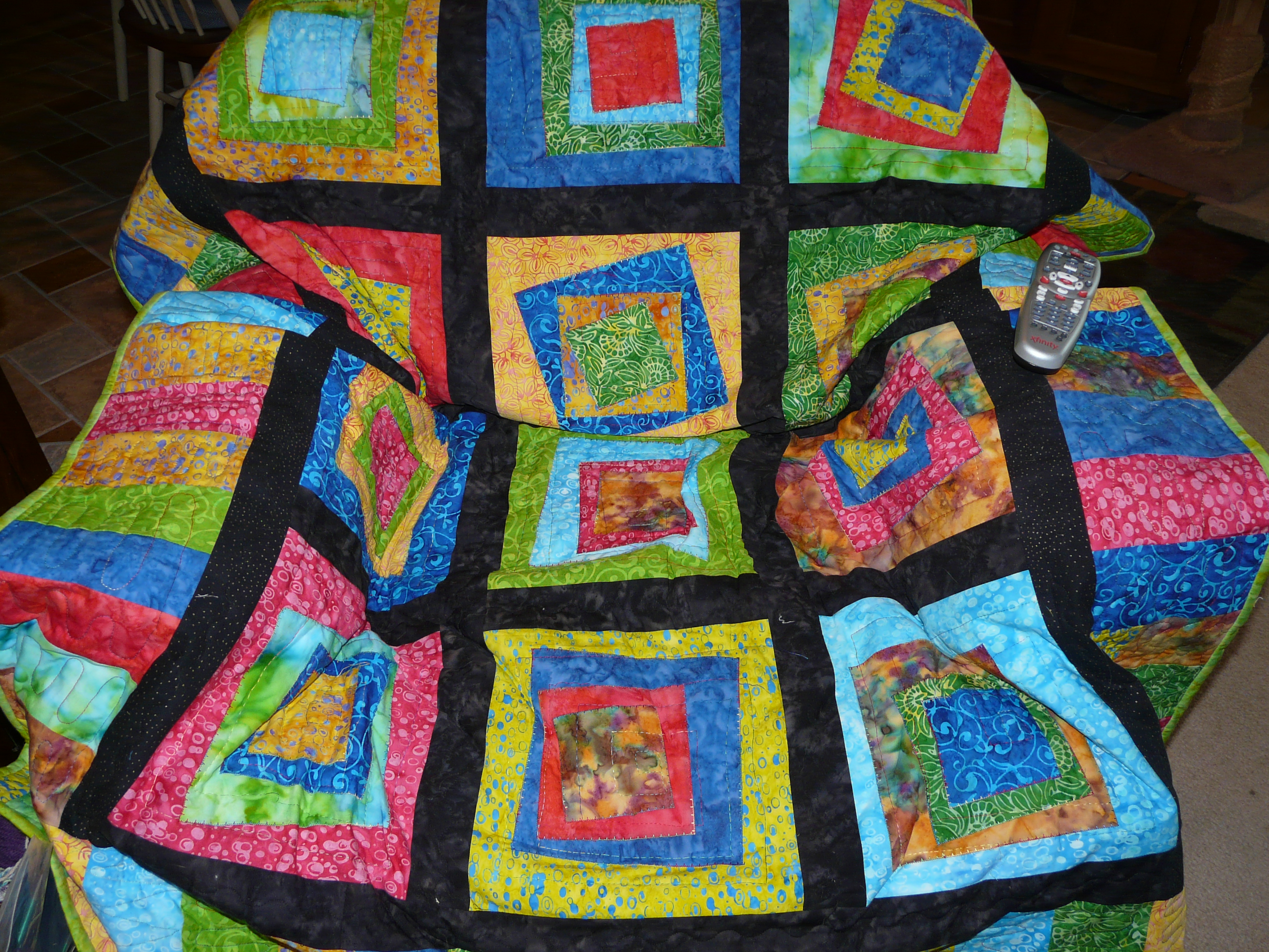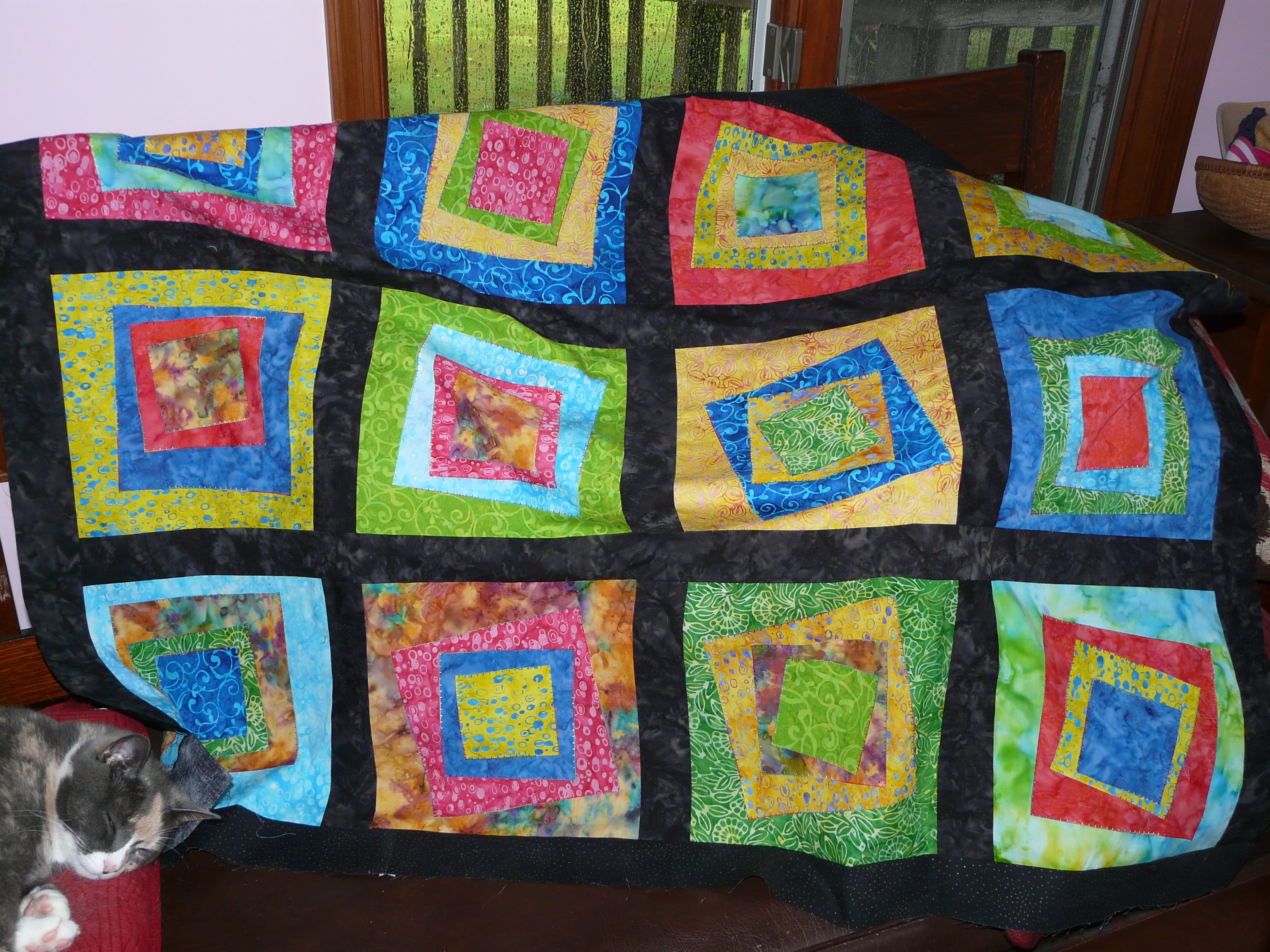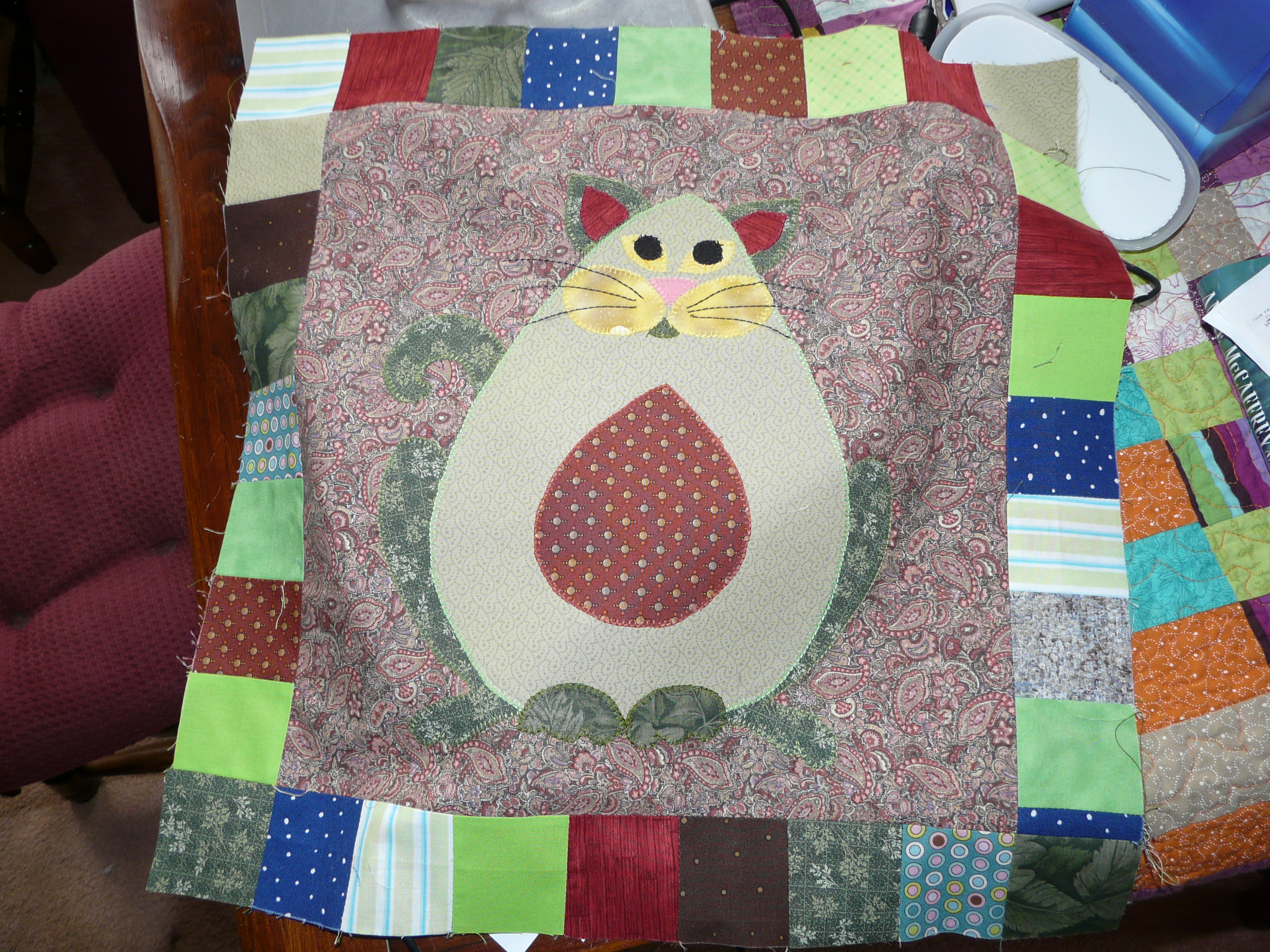 Now, this is a quilt. It still needs a border. It needs to be big enough to cover an over-stuffed chair. Flo likes to lay on the top of the back and everyone likes the cushion. Since it’s off white, it needs to be covered. The chair came with the house. It will probably be replaced when we expand the living room. Or not. We do have a dog chair. Why not have a cat chair?