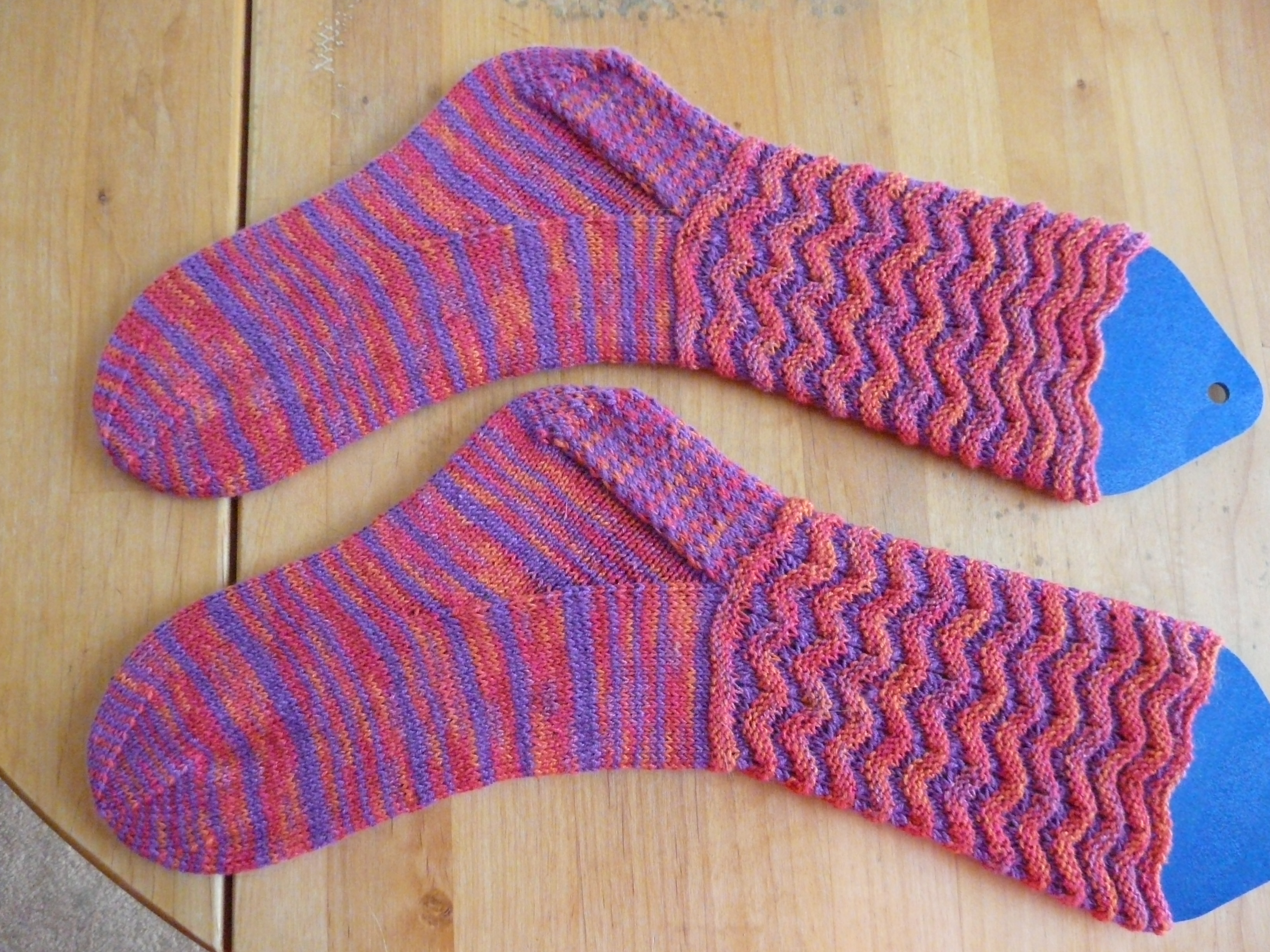 This is not the quilt. These are my wavy socks. You can see the purple peeking out on this picture. If you want the pattern, it’s on the right under Wavy Panda Silk Socks. I haven’t put it on Ravelry yet, so you’ll have a first.