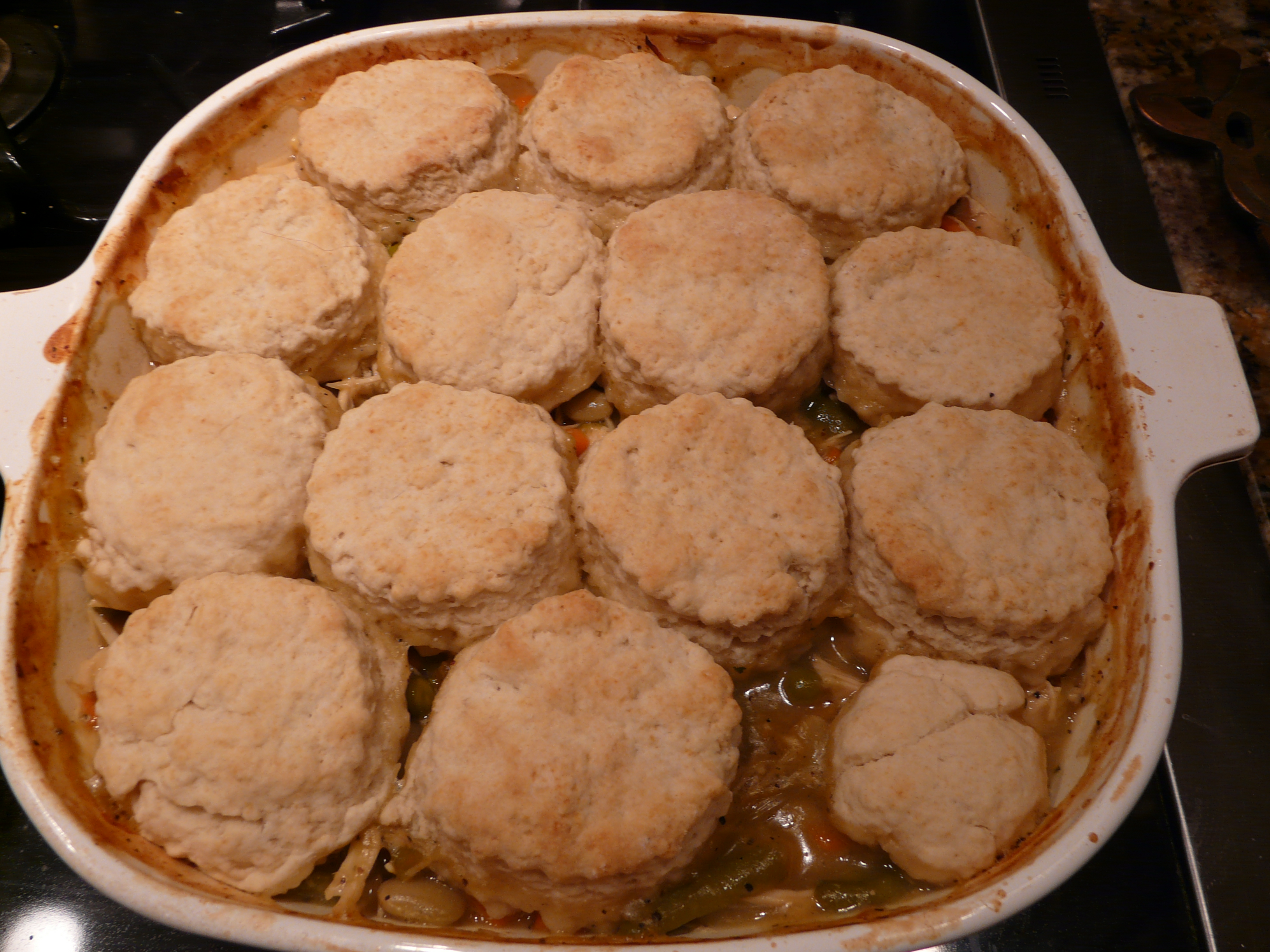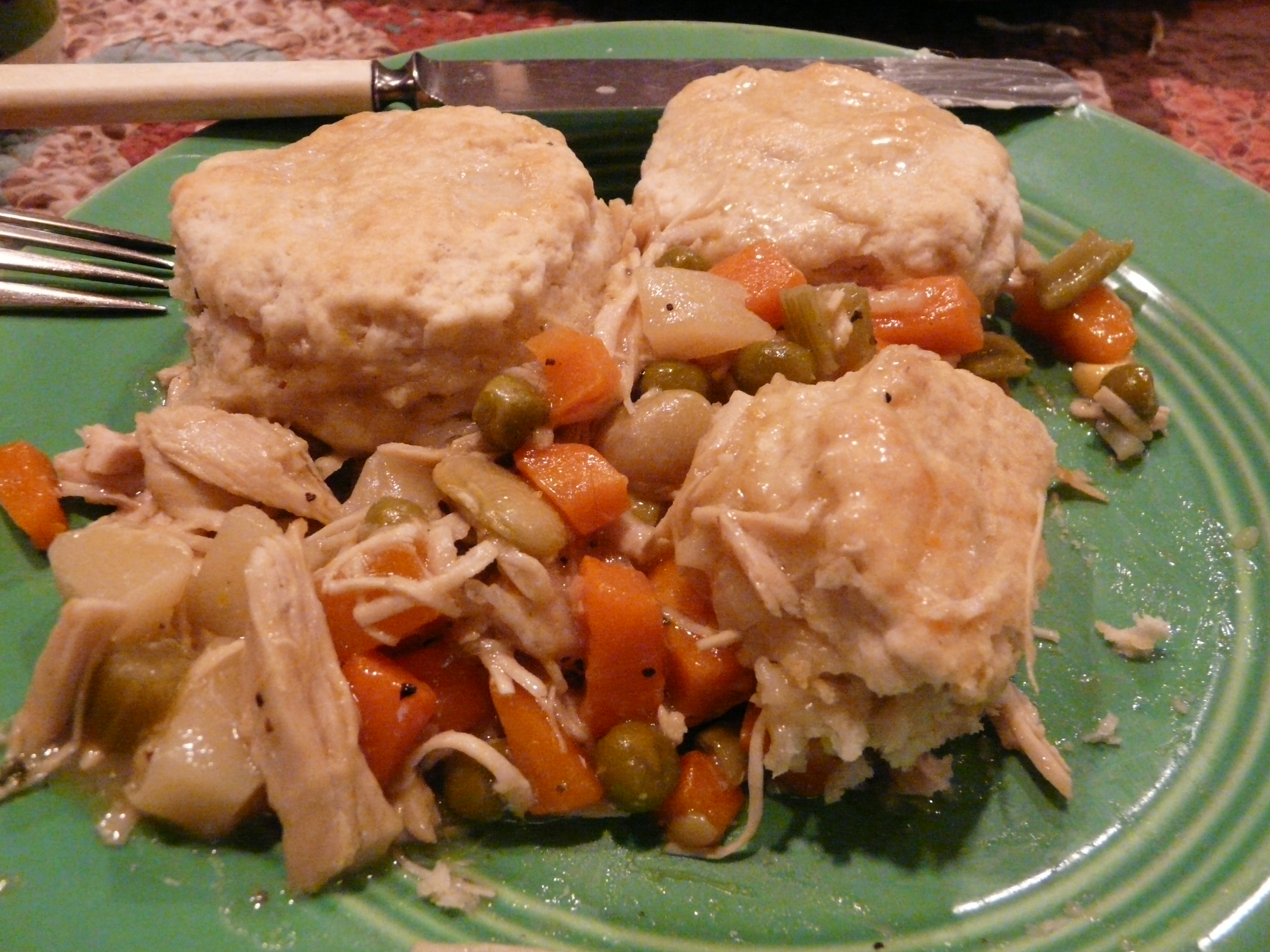 I made turkey potpie. Only, I don’t make a pie crust. I make biscuits. Unbeleivebly good! So easy. Leftover turkey, gravy and vegetables. If you don’t have enough vegies left, canned mixed vegetables work well. Make the biscuits with just enough milk to hold them together. Oh. You don’t make biscuits? Well, you should. I’ve never tried the ones in cans. You will notice that I use an old Corning ware pan. I put the turkey, vegetables and gravy in the pot on a medium setting. Stir it up good. Sometimes I have to add a little water or a little flour. It should be a little thick. If it’s too thin, the biscuits will sink too much and be down right yucky. My oven is set at 400 for about 20 minutes. The biscuits should be nicely tanned on top.