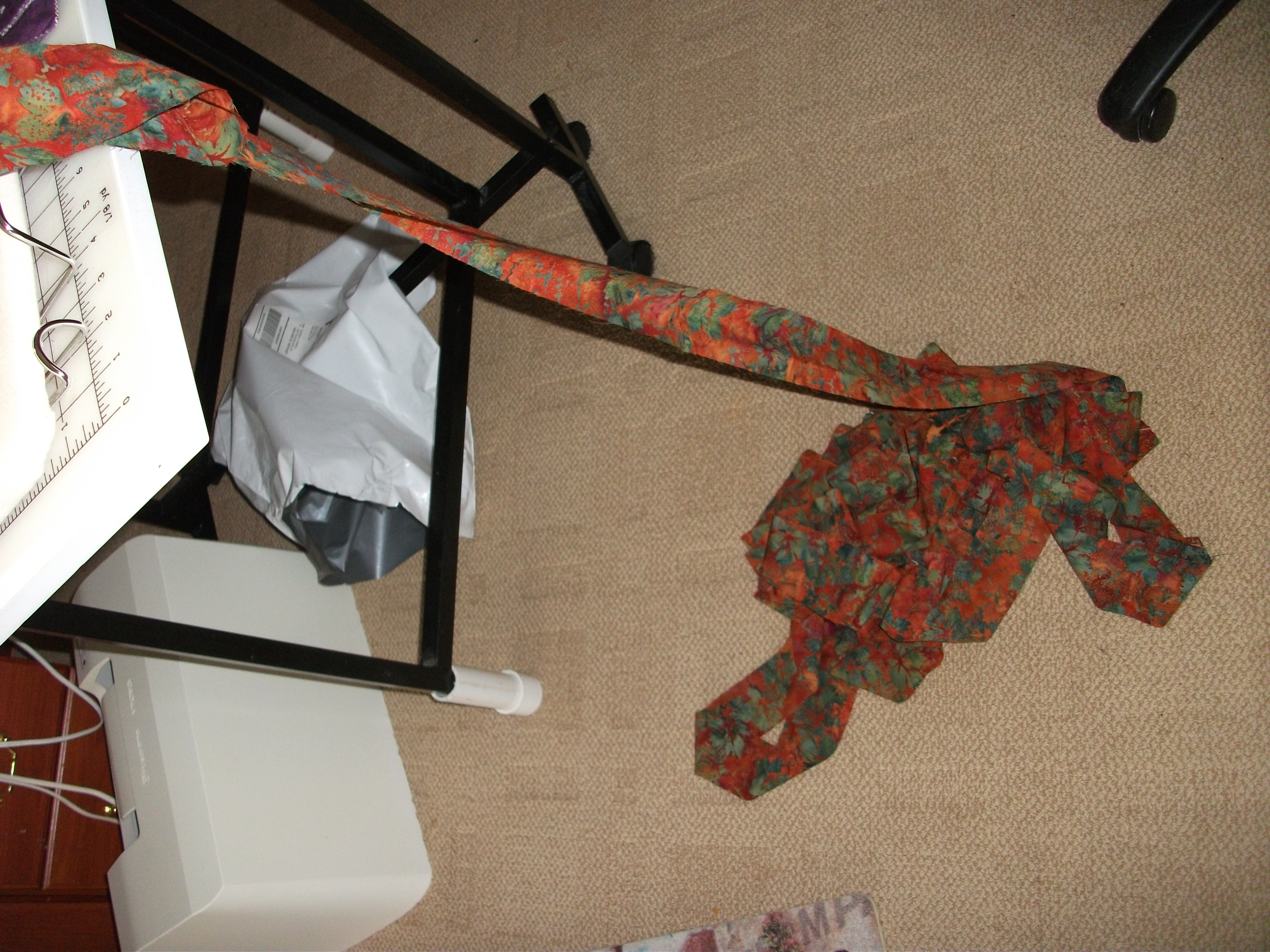 I cut three yards of fabric into two and one half-inch strips and now I don’t know where the picture that I took has gone. Pictured here is about ten of those strips sewn end to end. When I saw this fabric, I knew it was THE ONE. I had been agonizing as to the color to use to border the squares. Black is the common choice, but I don’t like black and I have trouble with ‘common’ in general. I was thinking about a brown. It’s an unobtrusive color, but it is a color. I also thought about red. And what about a red/brown? Then I saw the green and brown–something that I never thought of. Sometimes, you just have to wonder through a few fabric stores before you know what you want.