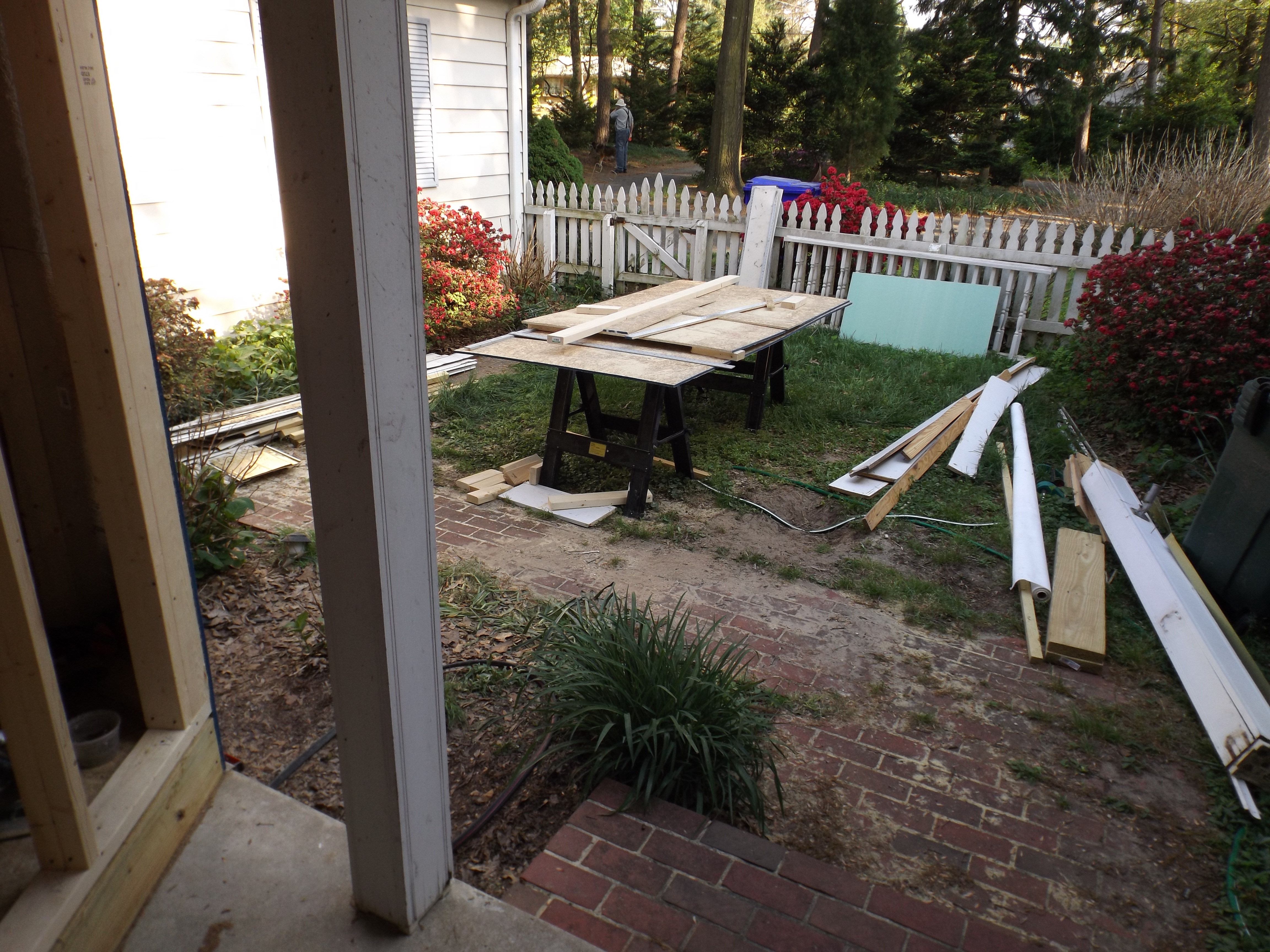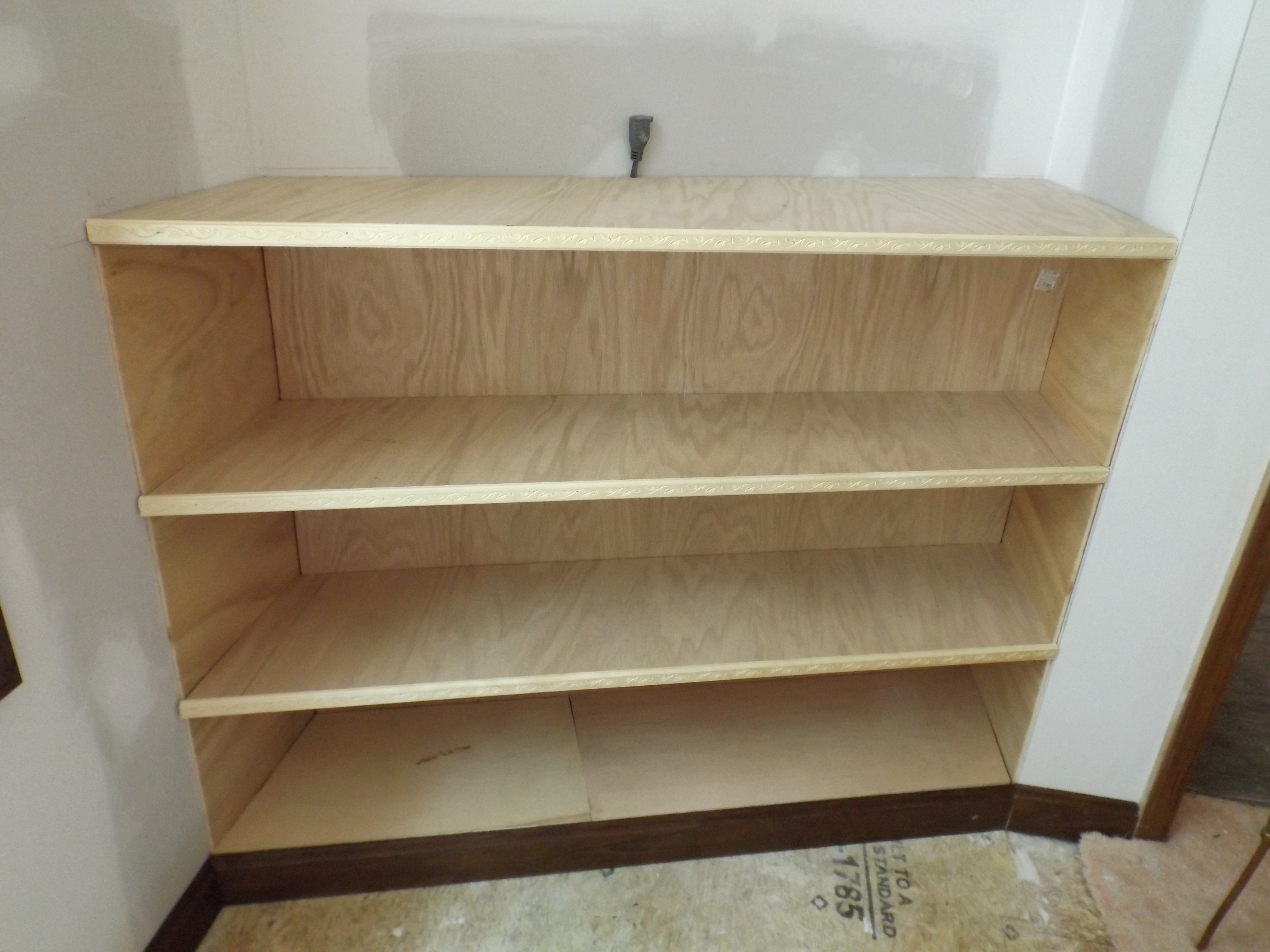 Frank made us a bookcase for the awkward corner opposite the front porch. Does it look level to you? Well. It is. Really. It was Sweetums’ idea. I’m so proud of them. Now we’ll have to see if Sweetums can stain it without getting it all over the walls.