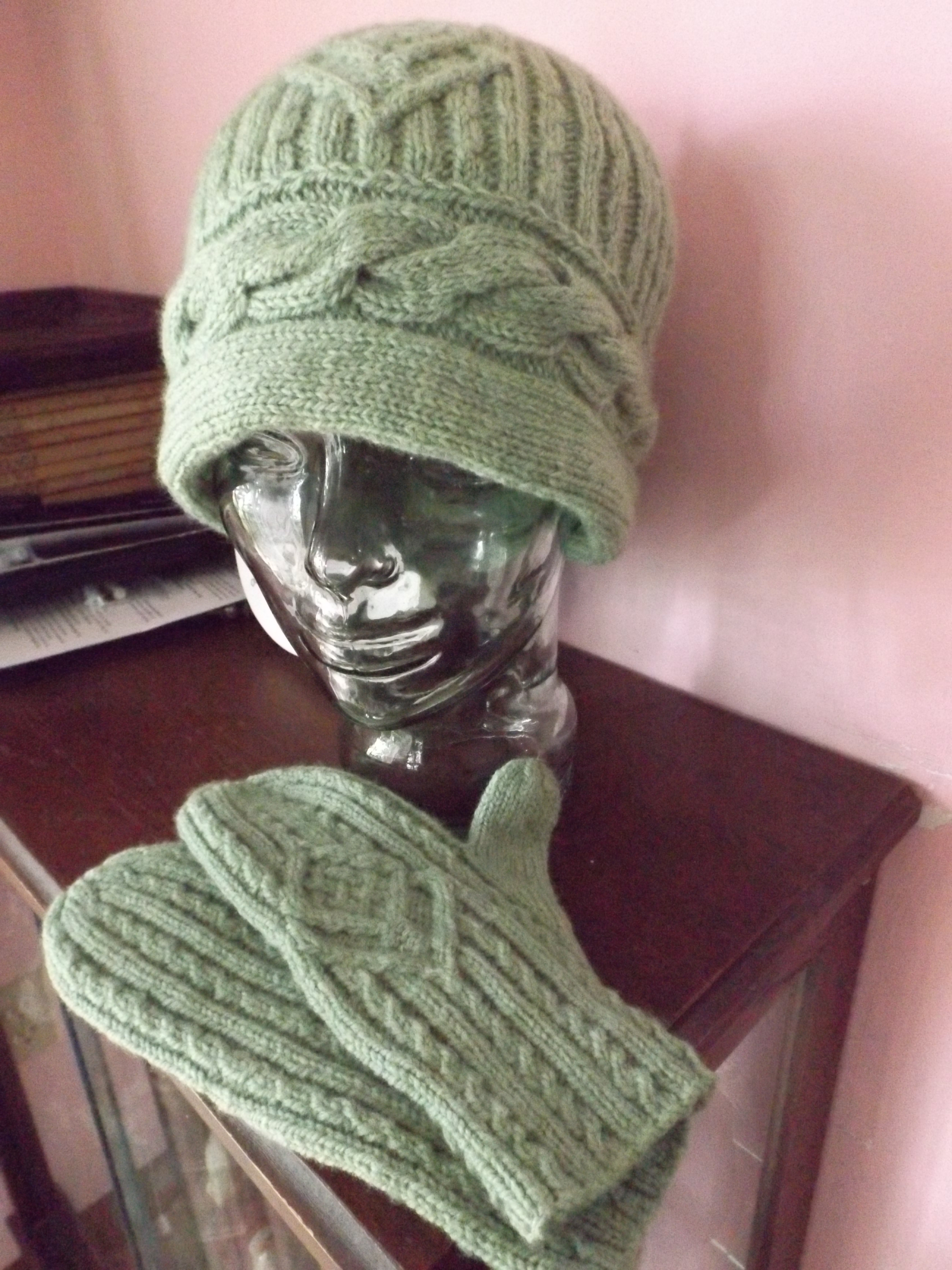 Since I had half of the yarn left from the mittens, I decided to make the matching hat. I had one yard left. ONE YARD! OMG! Was I ever lucky. I put that one yard in a tiny plastic bag. Now. Where did I put it? Does the hat look too big? It’s not. It’s just that my glass head is about an inch and a half smaller than my real head. It has to be, with all the crap it’s got in there. So anyway. I really like this hat! It fits well and even better, looks good on my head! The construction was a lot of fun. The cable brim is knit in a strip, then sewn into a circle. Stitches are picked up along the upper edge and knit in the round. The pattern also comes with a matching scarf. You can buy it from Beth Brown-Reinsel at http://www.knittingtraditions.com.
