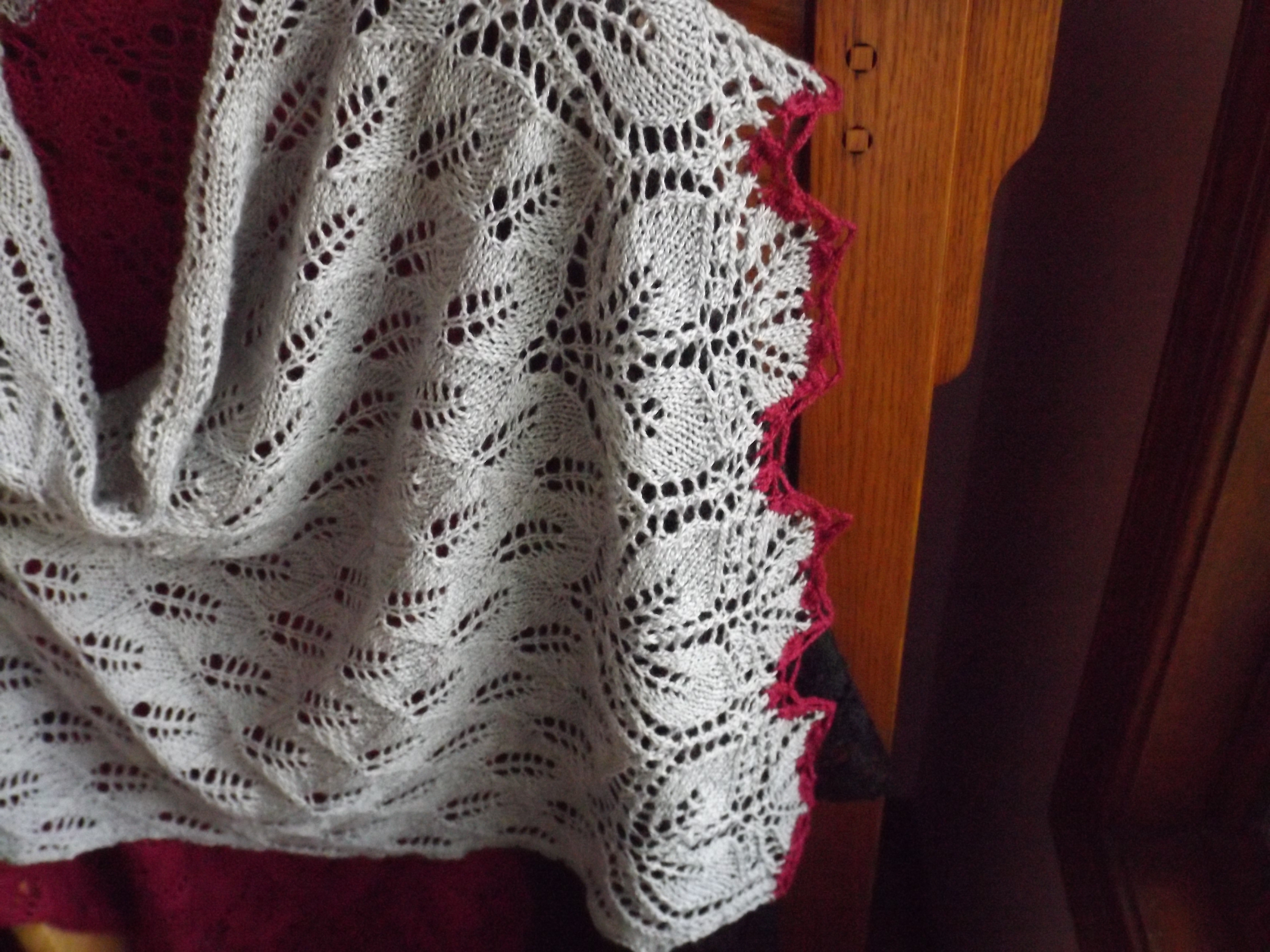 I cannot make up my mind about this one. I like the way it lies on my shoulders without my having to hold onto it. That’s why I don’t care for triangle shawls. Well, most of them anyway. I do have one that I am very fond of. I’ve got better things to do with my hands.