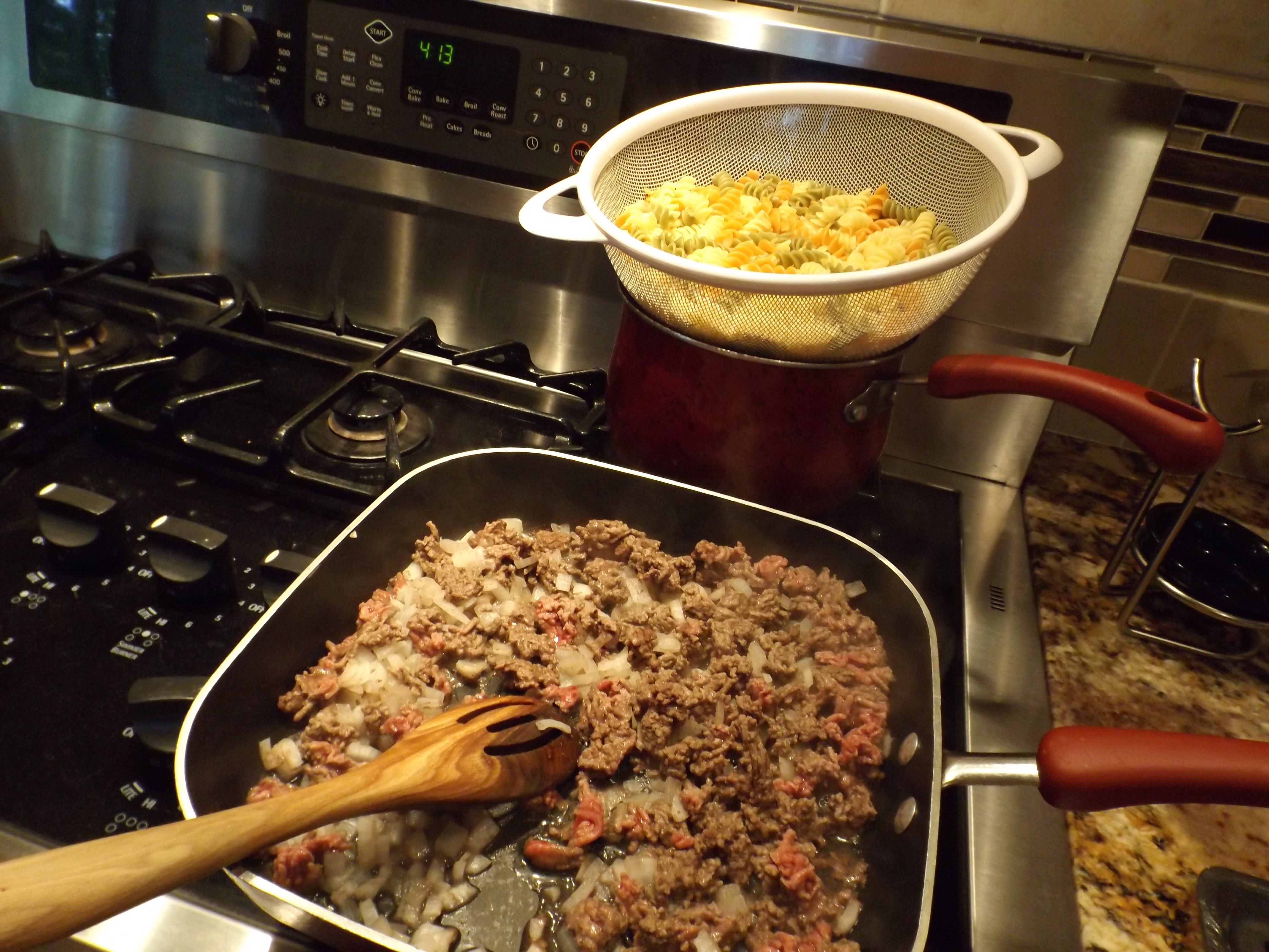 So. Anyway. I had this pound of ground beef. It’s what I get when nothing else appeals to me. I looked through the kitchen cabinets and at some recipes. I chopped some onion, threw it with the meat in a pan to brown. I boiled some noodles. So far so good.