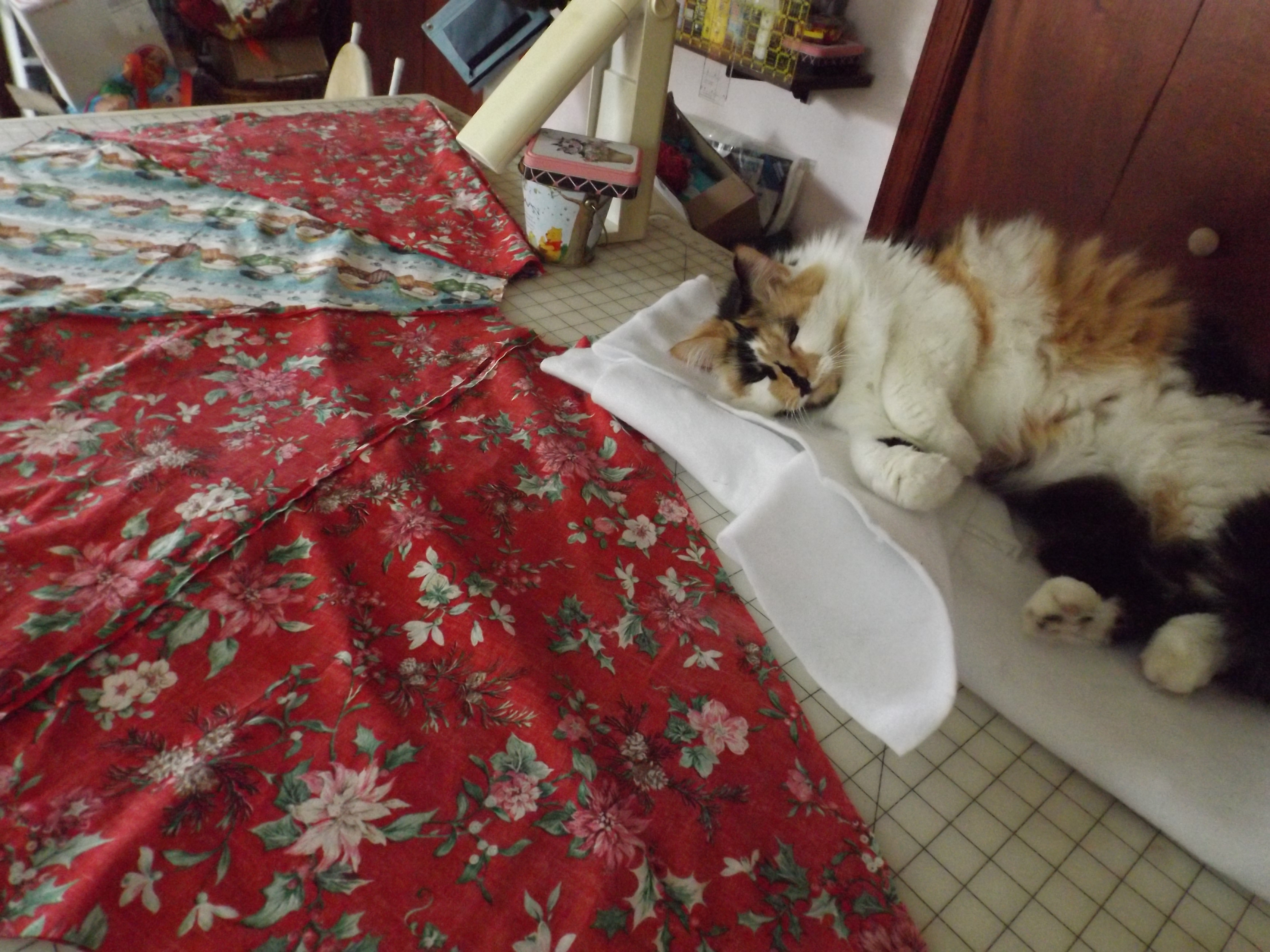 DSCF1106  The back was finished, so I dragged my batting.  Dot was not much help.  She kept falling asleep.  She liked the fleece, but I would have had to piece it in two places.  I got out the Warm and Natural.  I didn’t really want to use it, but it’s 96 inches wide, so, no seaming.  Now, there’s only two  yards left.  I’ll have to order some more soon.  I hope to get the quilting accomplished tomorrow.  We’ll see.