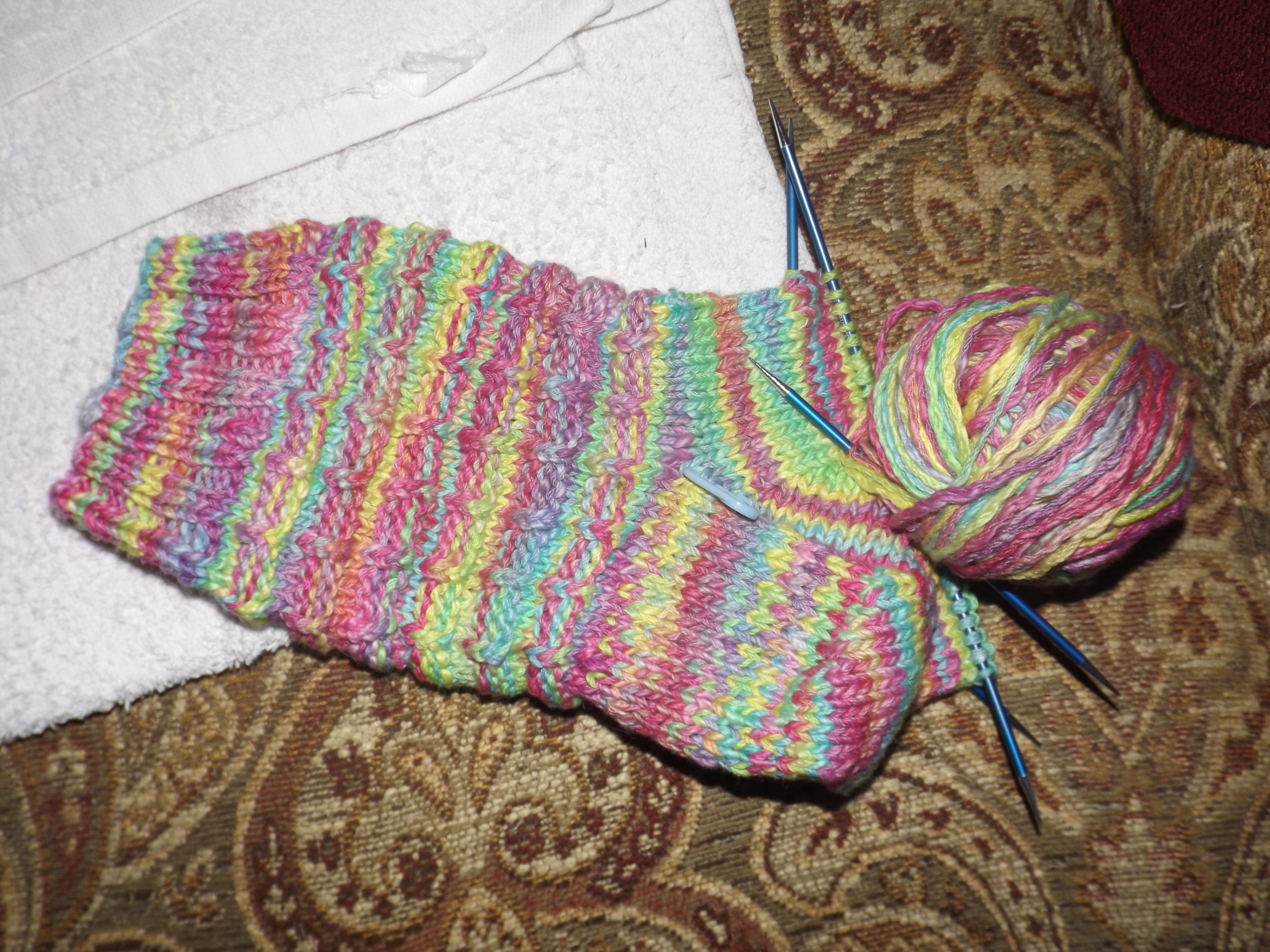 I love these colors. I don’t think I have anything that they won’t match. These are cotton so they are four stitches bigger at the ankle than at the foot. I should be finished with these tomorrow.
