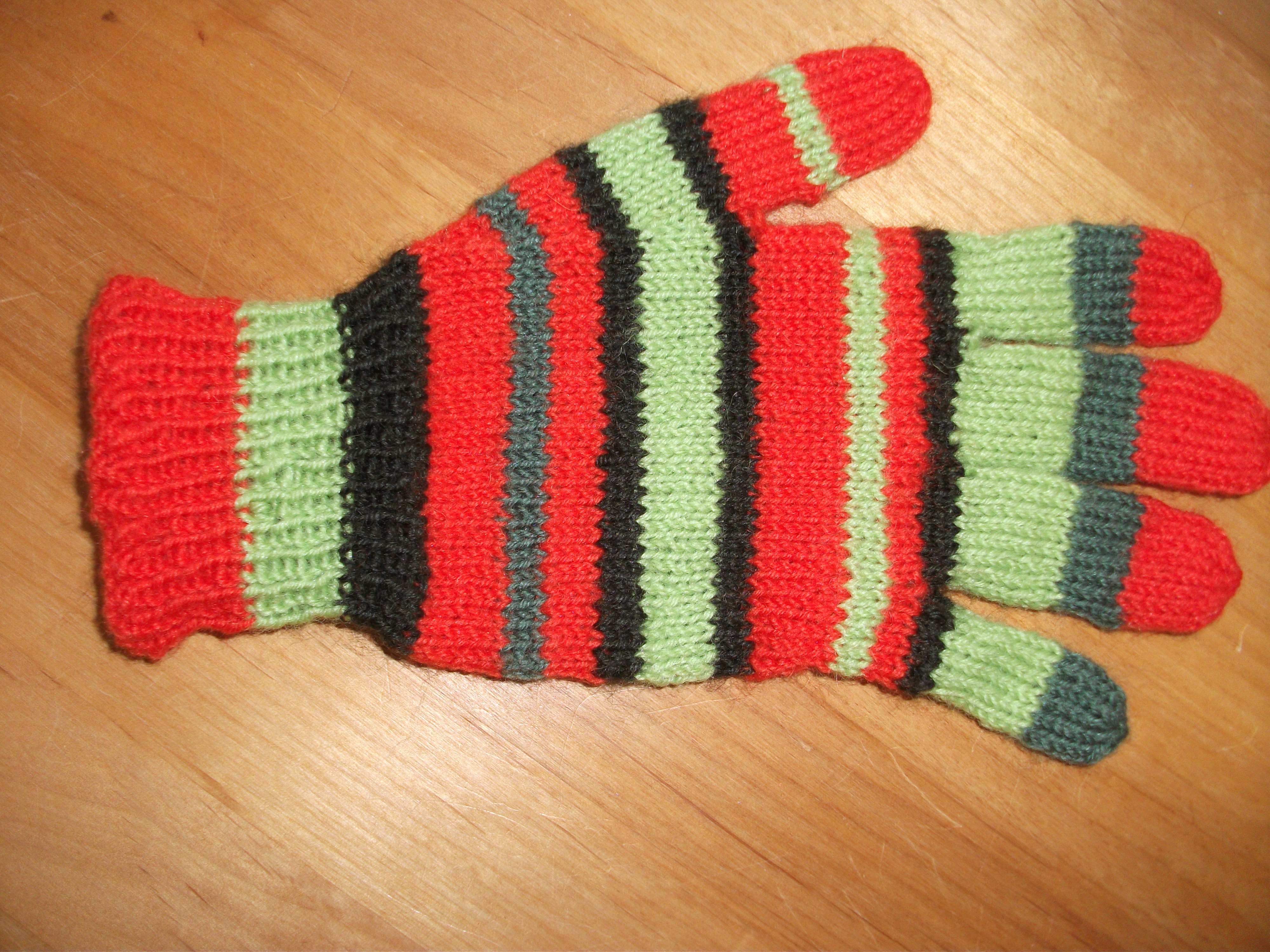 After you finish the pinkie, knit three rows in dark green for the 1/4″ as instructed in the book. Then continue with the color sequence. The thumb should have 7 rows, orange, 3 rows light green and finish with orange.