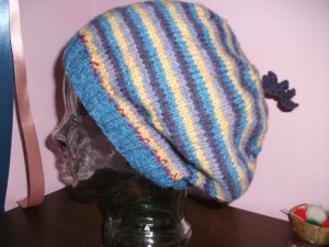 For a finishing touch, I made a worm. Using a backward loop, cast on an additional 26 stitches. Turn and knit and purl in first stitch. Bind off by passing first stitch over the second. Continue to knit and purl in each stitch and bind off by slipping first stitch over second until one stitch remains. Cut yarn leaving a 6″ length and pull through last loop. Worm will curl on its own. If this is too confusing, you can knit and purl in each stitch, then turn and do a regular bind off, but your worm will be thicker and you will have to weave the end through the worm. If you use my method, you can weave the end on the inside of the tam. Or just make an I-cord.