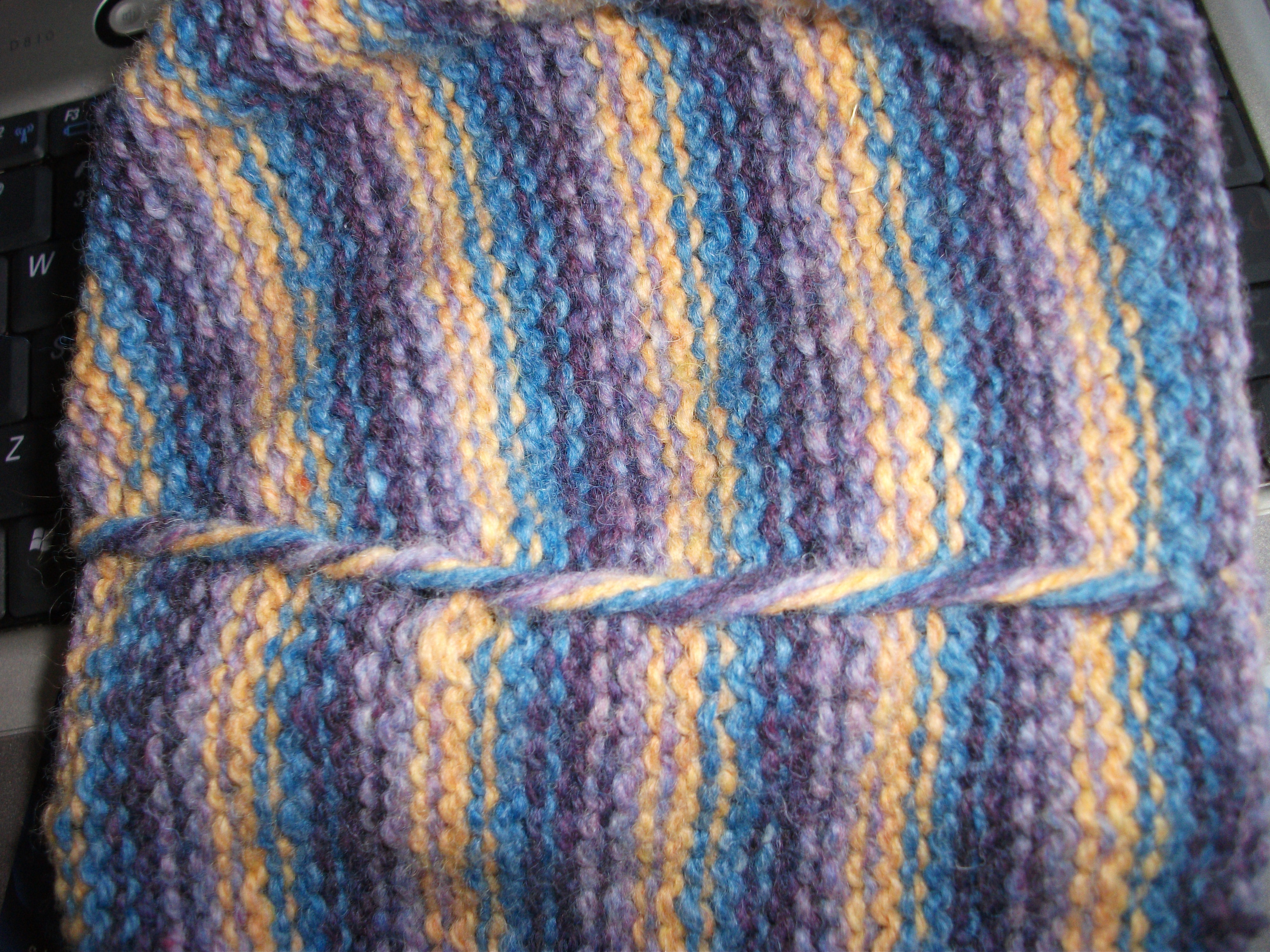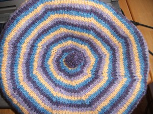 For a striped tam like mine, change colors every two rows. Bring the next color over the others every other row. Don’t pull at it. As long as the new yarn is brought up and over the old, any holes that may appear will close after a few color changes.