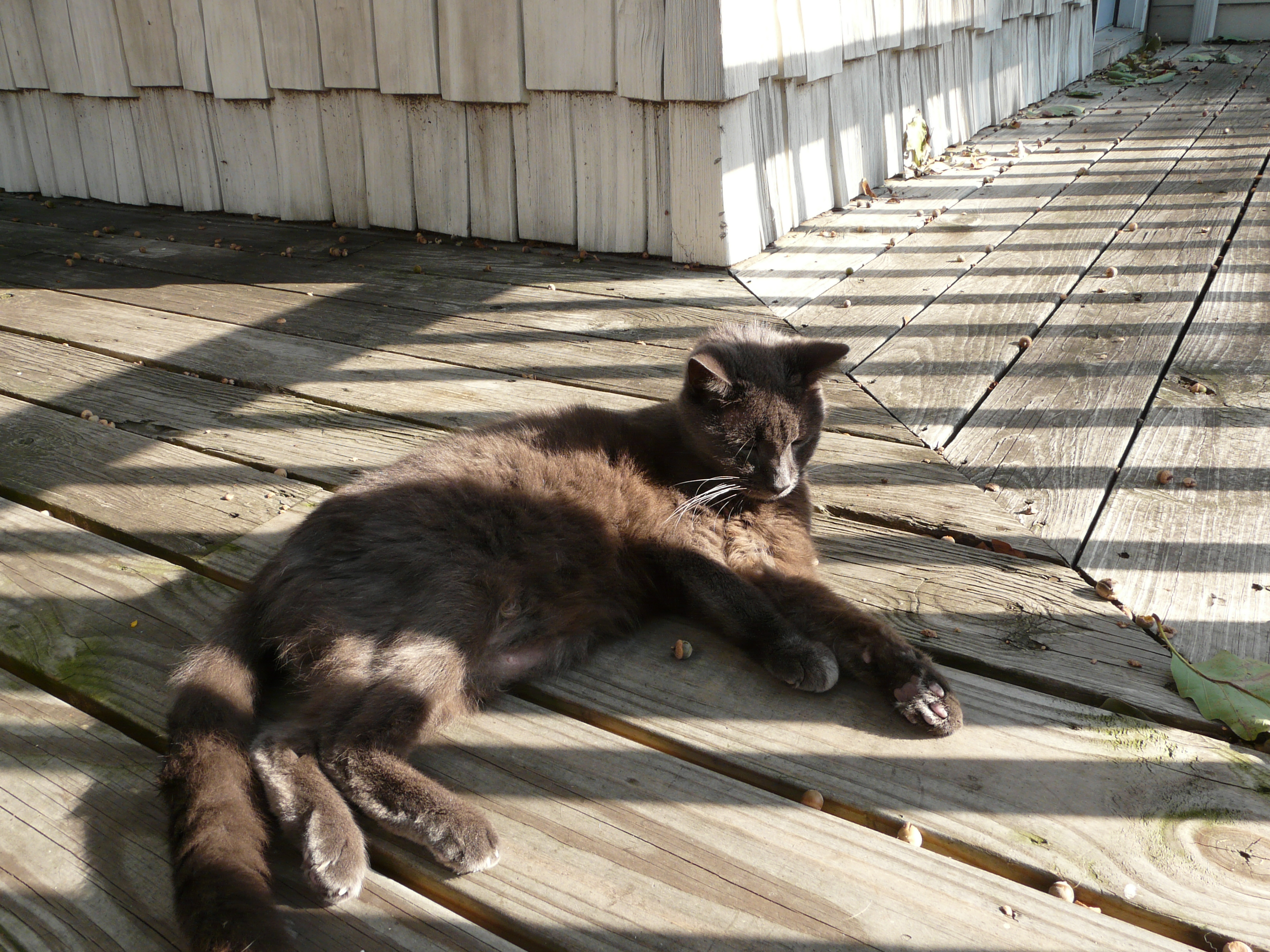 Doug was helping Paul get his boat out of the water for winter. Paul got out the trailer and they hooked it up and took off. Linda saw Elvis in her bushes so she was keeping an eye on the trailer. She didn’t want Elvis to get hurt. She should have kept an eye on Elvis. The front door was open and Elvis decided to have a look around in there. Later, Linda thought she saw a big rat in the hall and screamed. Elvis looked at her like she was crazy, but he decided to leave anyway. Her dog was doing a happy dance because he really likes my cats. Elvis, on the other hand, knows that all dogs are idiots and their feet have no attachment to their pea sized brains. He went out through the door to the garage and came home to his deck.