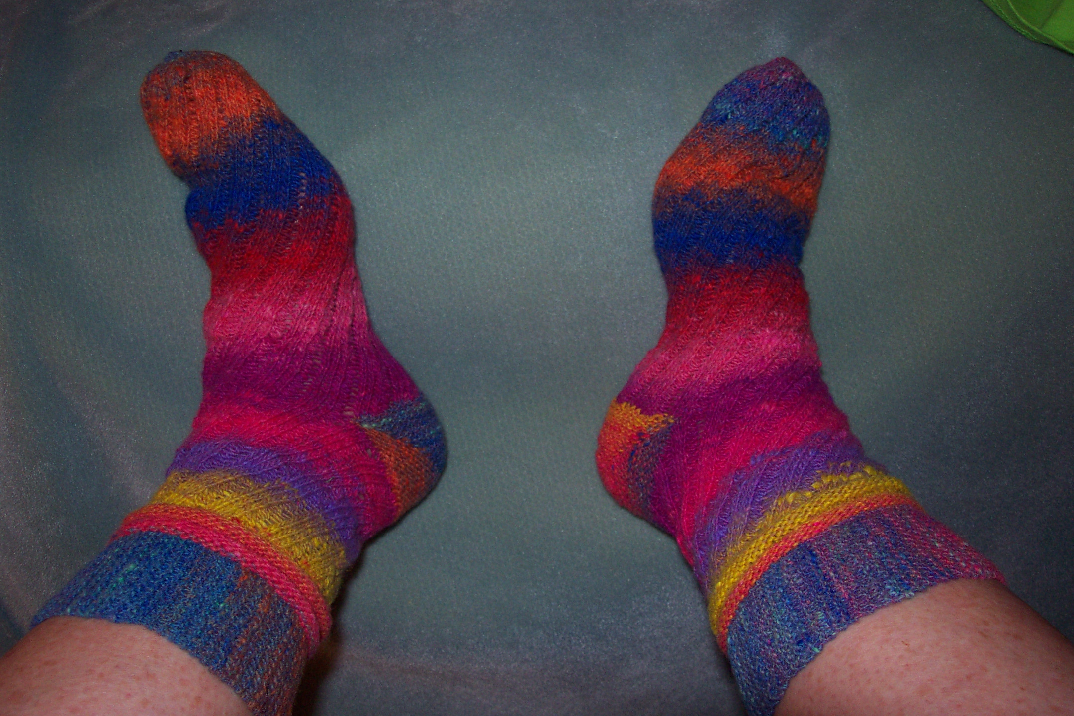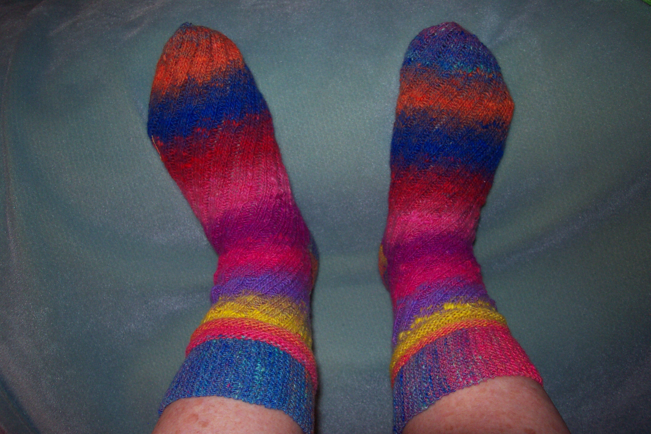 noro socksWell, it felt like it.  I was wasted by the time we got back from our walk.  I sat out back with a cold drink and knitted for about an hour.  Then I remembered my Noro socks so here they are, on my feet.
