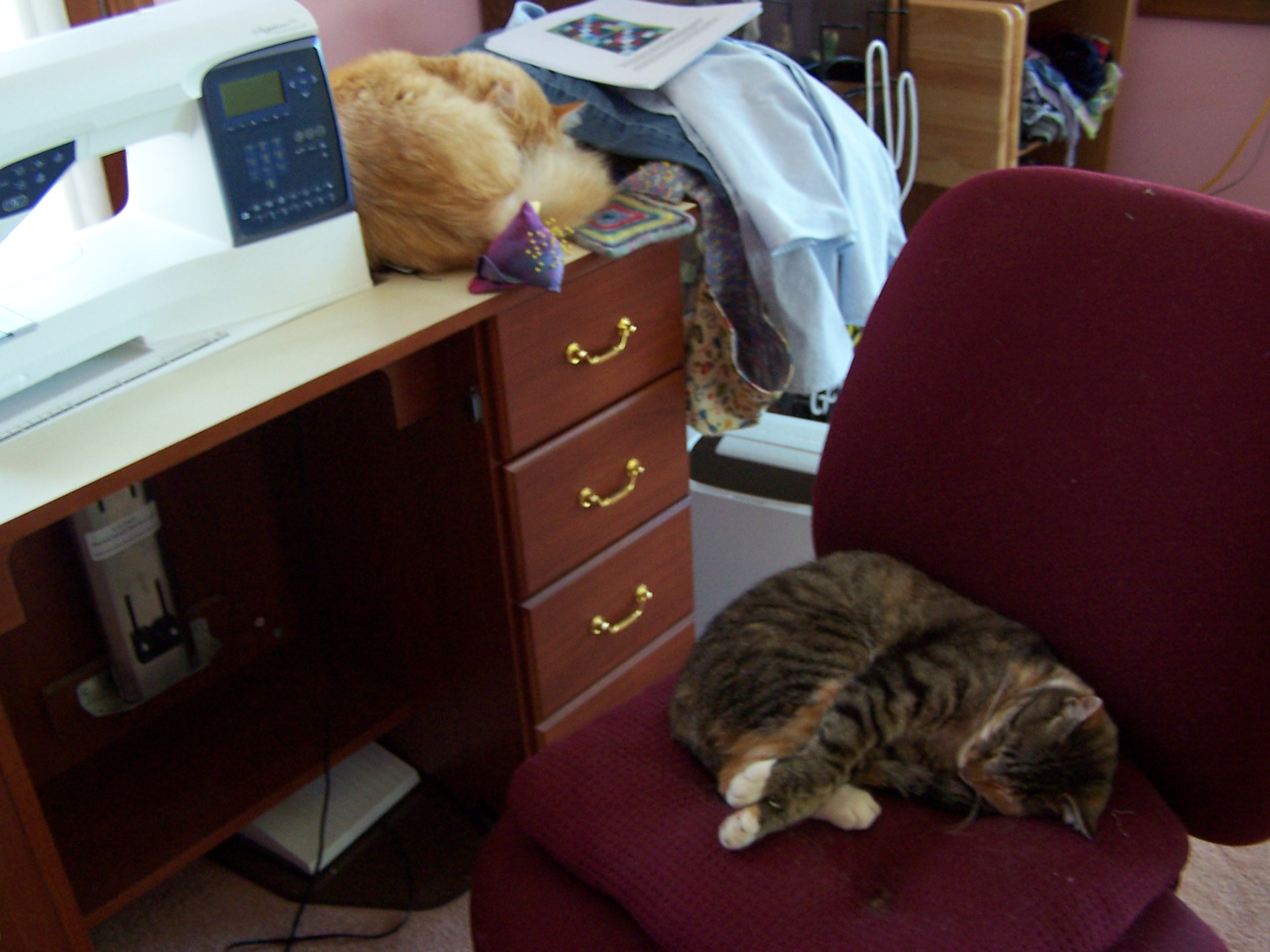 I was hoping to sew today, but Maude and Zip had other ideas. Under Zip are nine neat little stacks of quilt squares to be sewn.