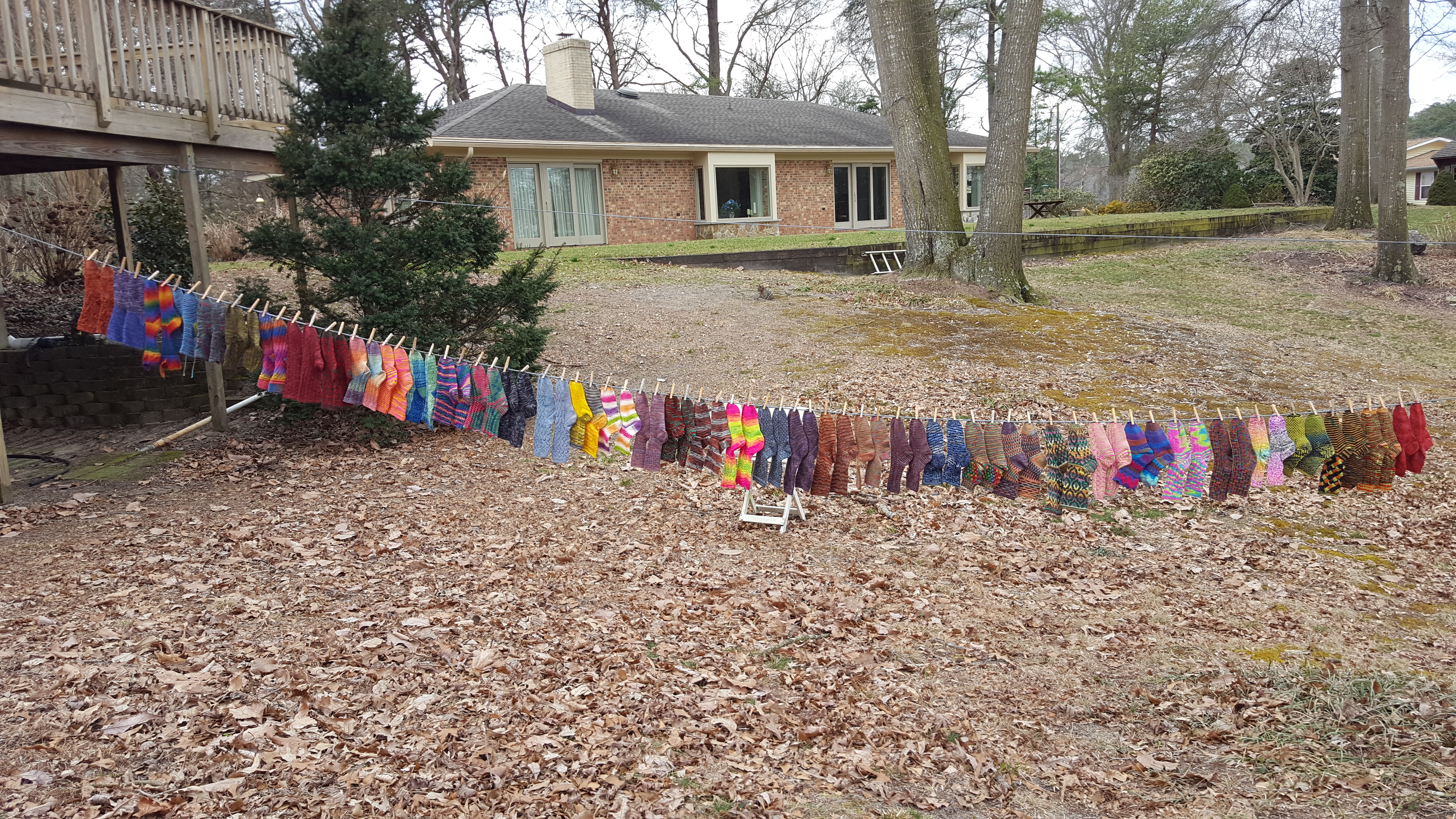 Here’s my socks. I should have taken my camera out with me. I get better results. I am so glad my machine has a hand-wash cycle. That’s 40 pairs of socks that were washed in one load. There was a bit of a breeze and they dried quickly. They seem to take forever in the basement.