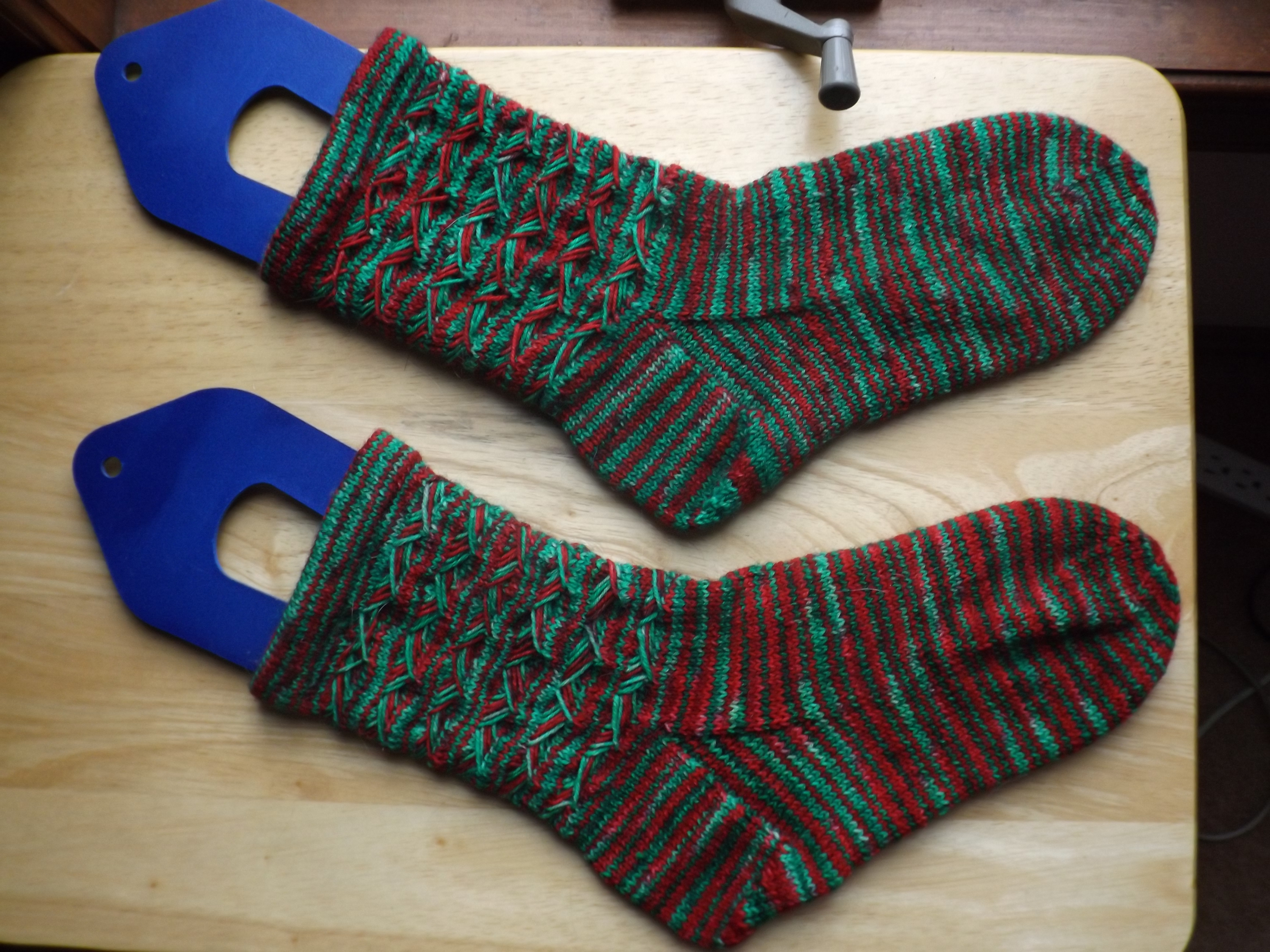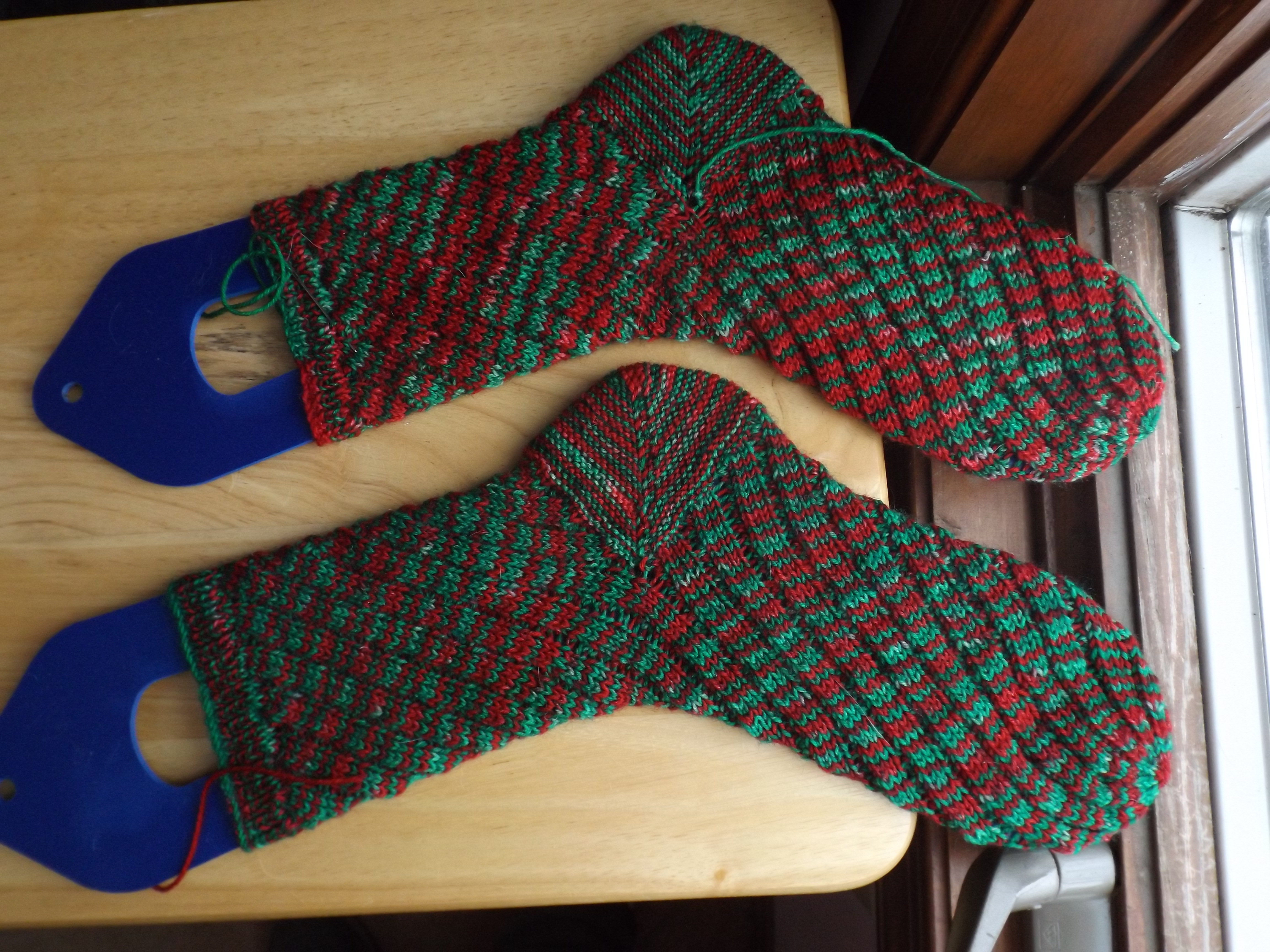 I made Christmas socks for my daughter and me. I had a hard time finding this yarn. I wanted a very red and a very green with no white or light color. It came from the Baltics and it is exactly what I had in mind. The diagonal socks for my daughter are basically a Lucy Neatby design that I have used a few times. The ones for me are right out of Socktopus by Alice Yu. They took longer to knit than I care think.