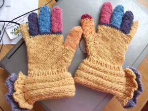 They’re not too funny looking, are they? They look better on, really they do. Here, again, I got out Ann Budd’s book to determine stitch count. I started following the brim instructions from the cloche. When I had worked 78 rows beyond the ruffle, I picked up and knit from the back of the ruffle and bound off at the same time. Do not cut the yarn. The last stitch is the first stitch of the hand. Pick up and knit 33 more stitches. Working in the round, knit one, purl one for four rounds. I did this to pull it in at the wrist a bit. Continue working the glove as in the book. In order to have a matched pair, I worked 77 rows so that I wouldn’t have to cut the yarn.