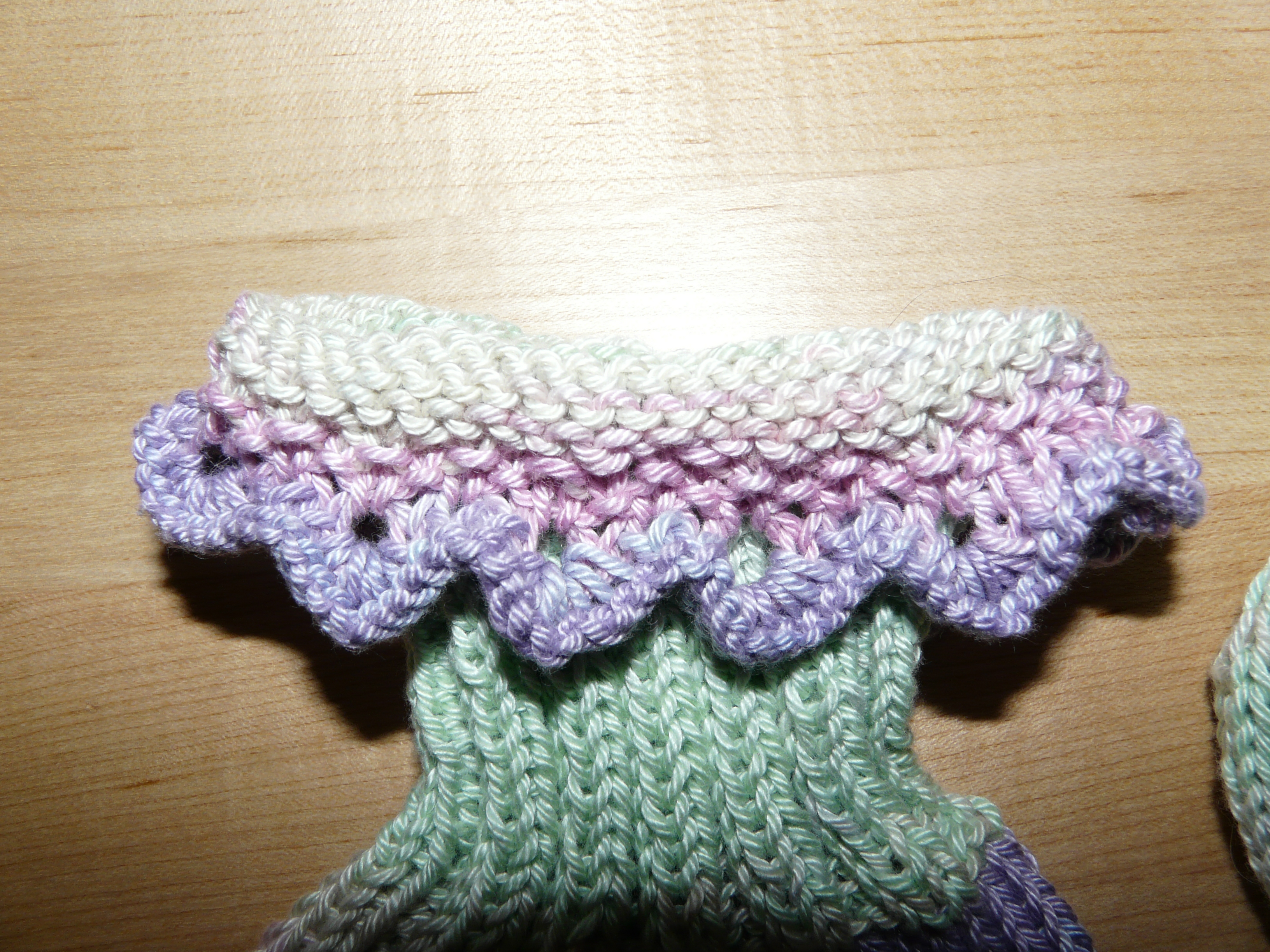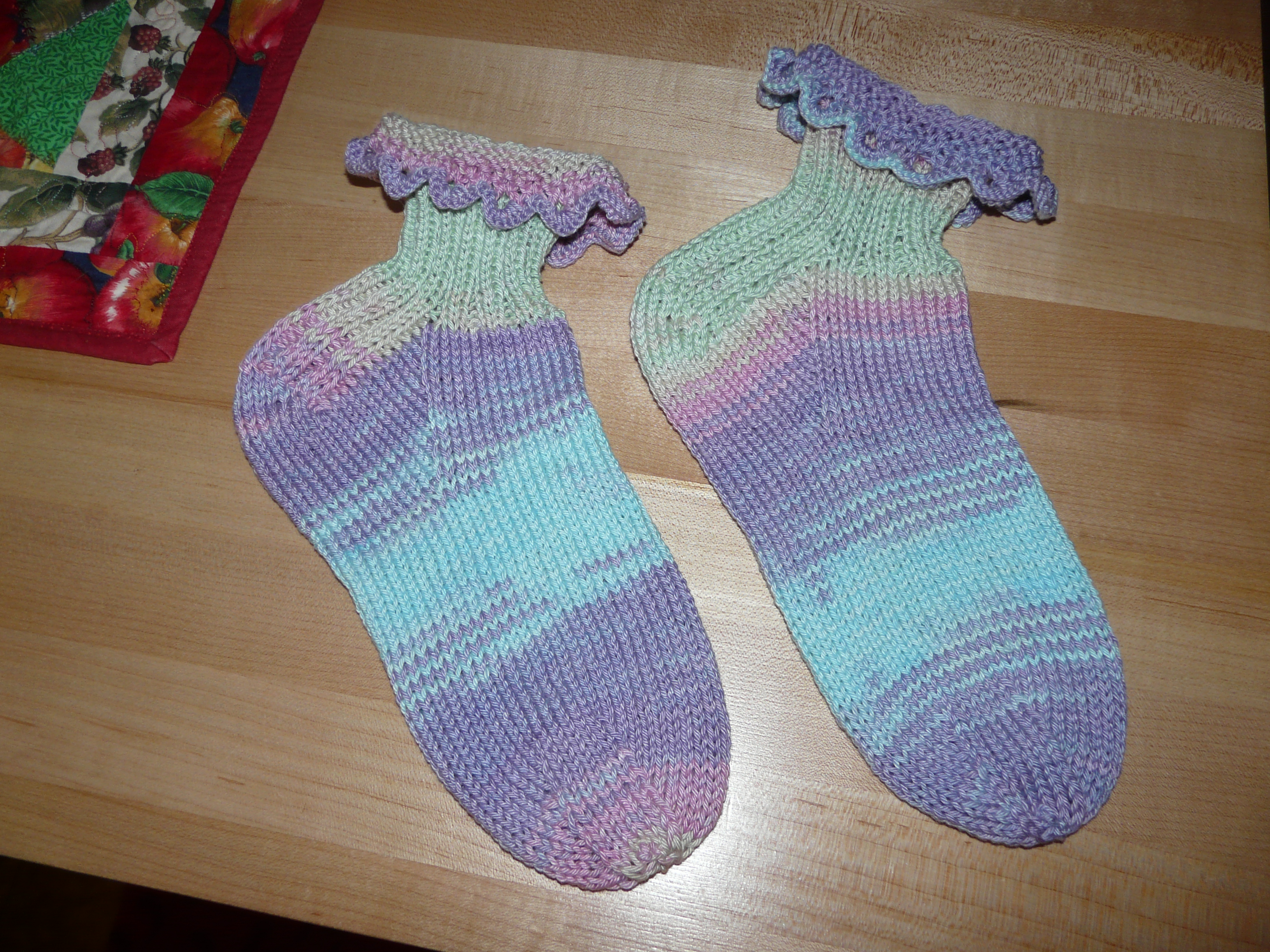 With the second pair, I went with a ruffle. I got out Lucy Neatby’s little sock book, Cool Socks, Warm Feet, and found just what I wanted. Using a little math, I figured I needed to cast on two and one half times as many stitches. I won’t tell you the rest. That would be unfair to Lucy. And I really like her.
