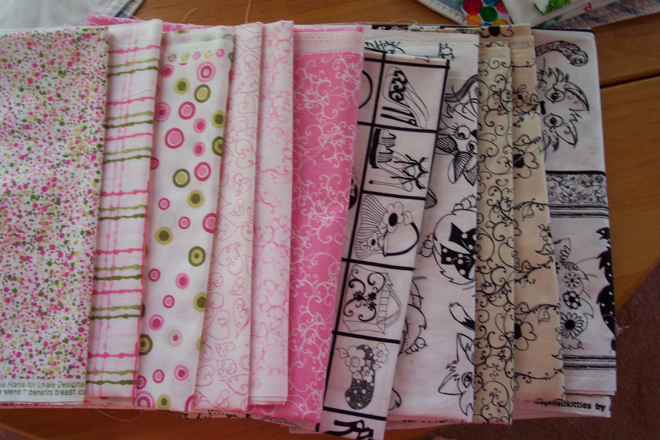 I managed to complete two of my night shirts. Maybe I will be able to get them all finished by Monday. Then I can prepare the new fabric. The brown print is polyester for a long sleeve blouse. The rest of the fabric I’m not certain what I will do with them. That’s not right. The green with watermelon slices will be place-mats. I forgot to buy ribbon to decorate them. I’m such an idiot.