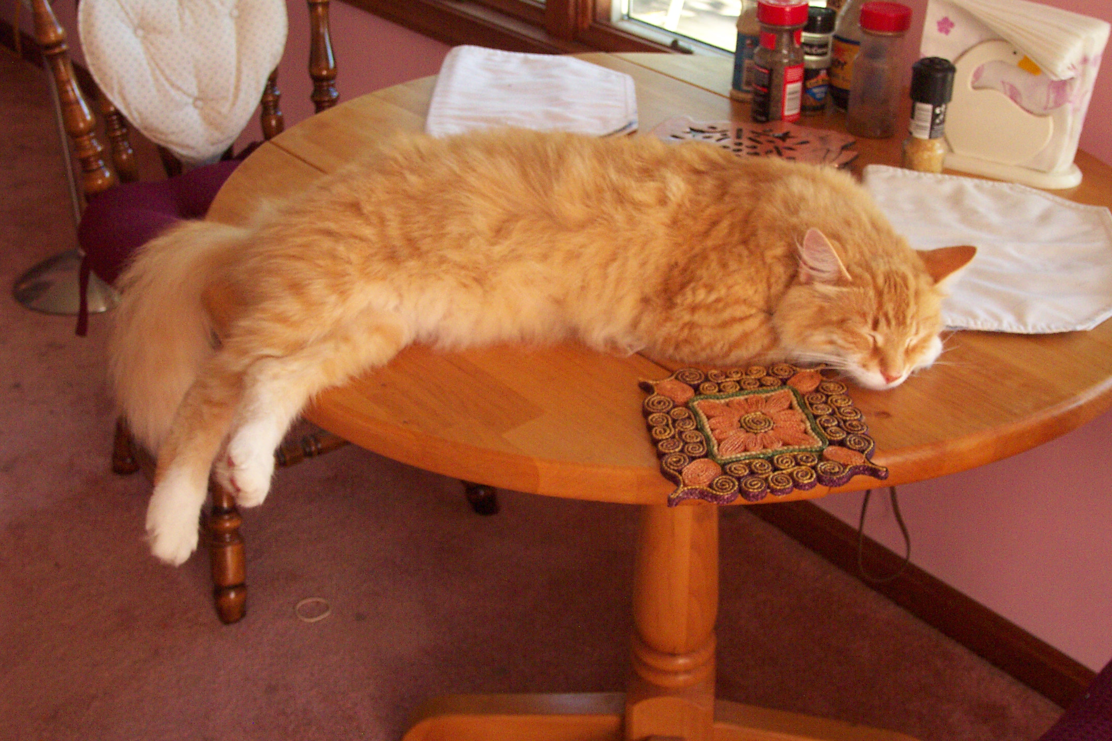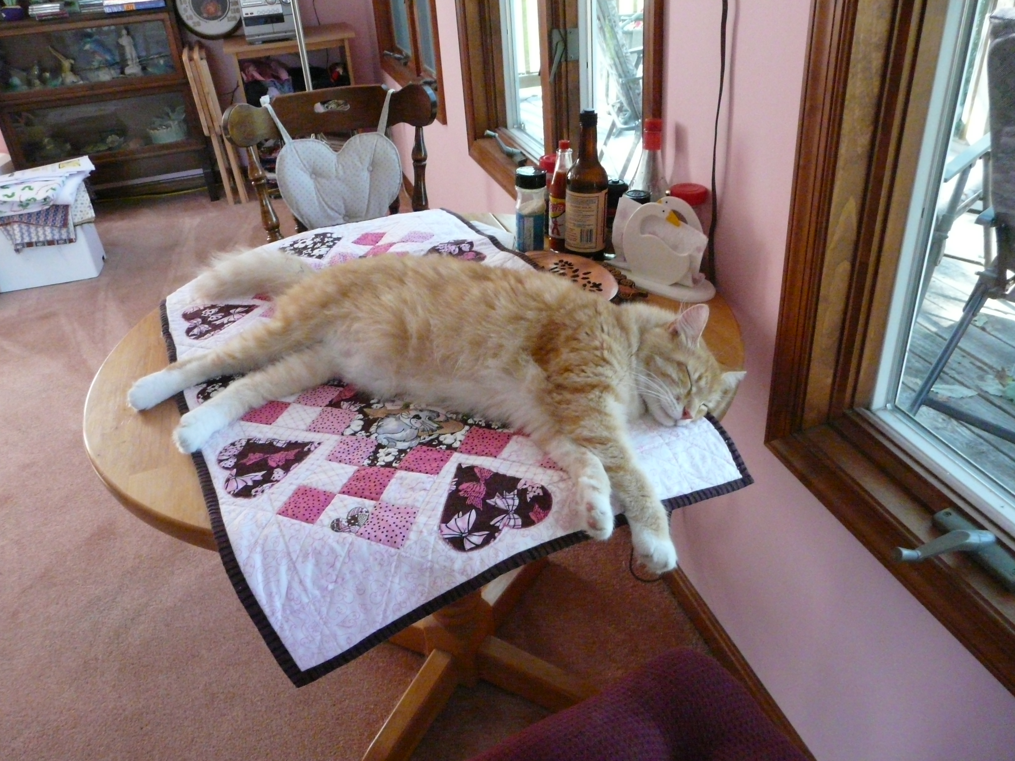 I tried to come with something better, but nothing materialized. It’s been good sleeping weather. Elvis is back to sleeping with us and now Zippo has joined him. Maude prefers the dirty clothes basket. She likes my quilt for naps. Speaking of quilts, mine is almost finished. Part six and five are done and were fun to do. I have started on part seven. If I can co-ordinate with Maude, I should finish it a few days.