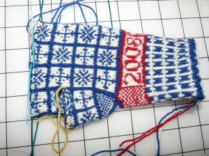 We had quite a bit of rain this afternoon. Is this rainstorm the remnants of a hurricane also? This one came rather quickly. I was sitting out back, happily knitting, when it started to pour. I have almost finished the contrast band and then it’s on to the dreaded thumb gusset.