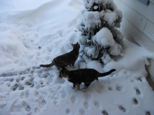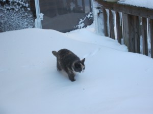February 11, 2010Last night, it sounded like rain, but it was freezing. This morning, it started to snow. Now it’s impossible to tell how much snow we had, it’s blowing so hard. Jenn called around noon. They had around a foot. She says only emergency vehicles are allowed out. He doubts anything will be open tomorrow either. Cora went out a few times, then gave up.