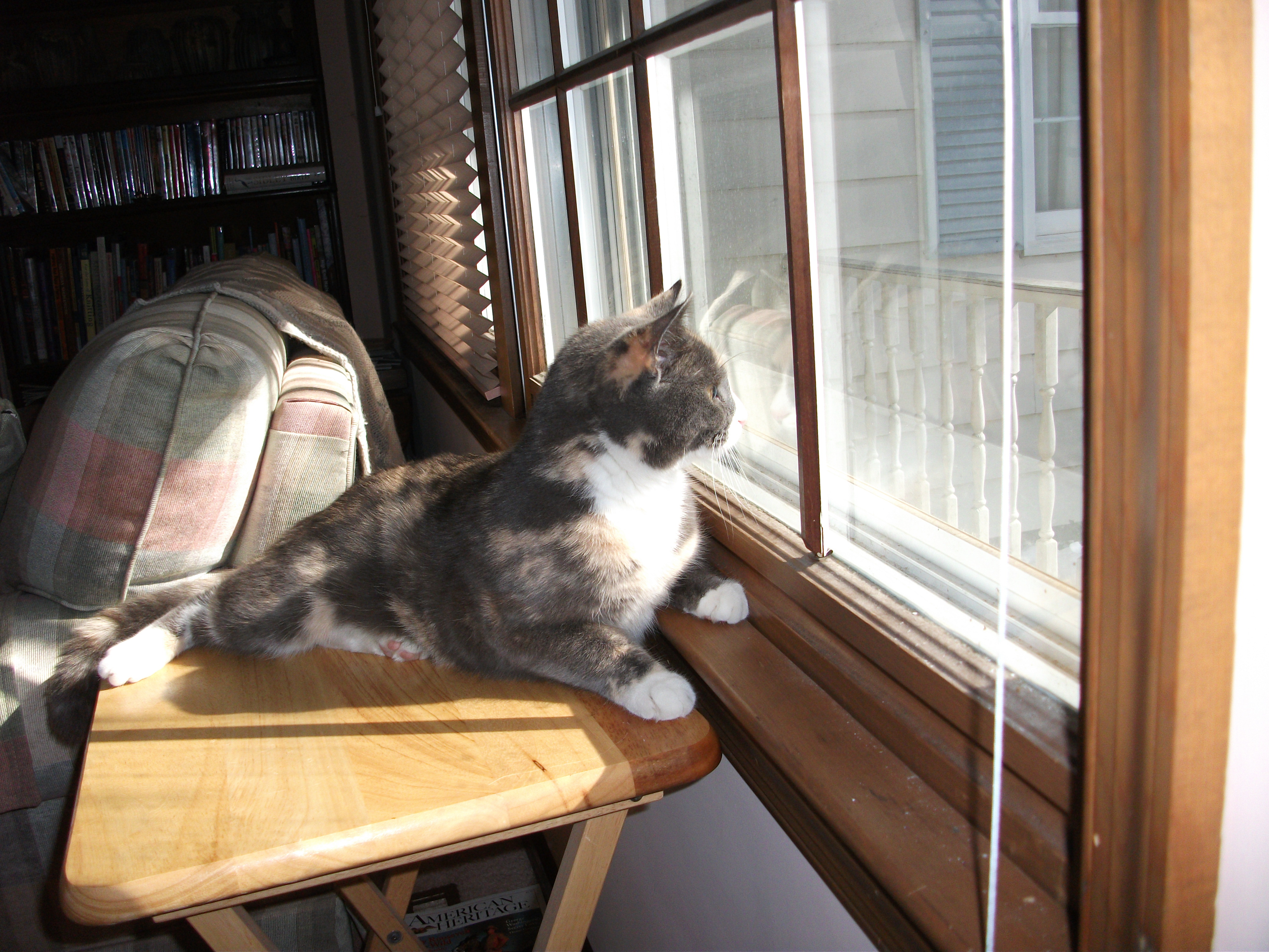 Here’s Biscuit, my son’s kitty. She’s adorable. She likes to look outside, but has never gone outside. You can leave the door open and she’ll look out, but that’s about it.