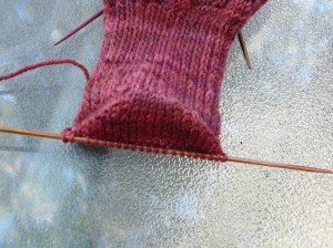 I normally use six needles at this point. There is a lost less stress on the needles and there is no gap going down the bottom of the sock.
